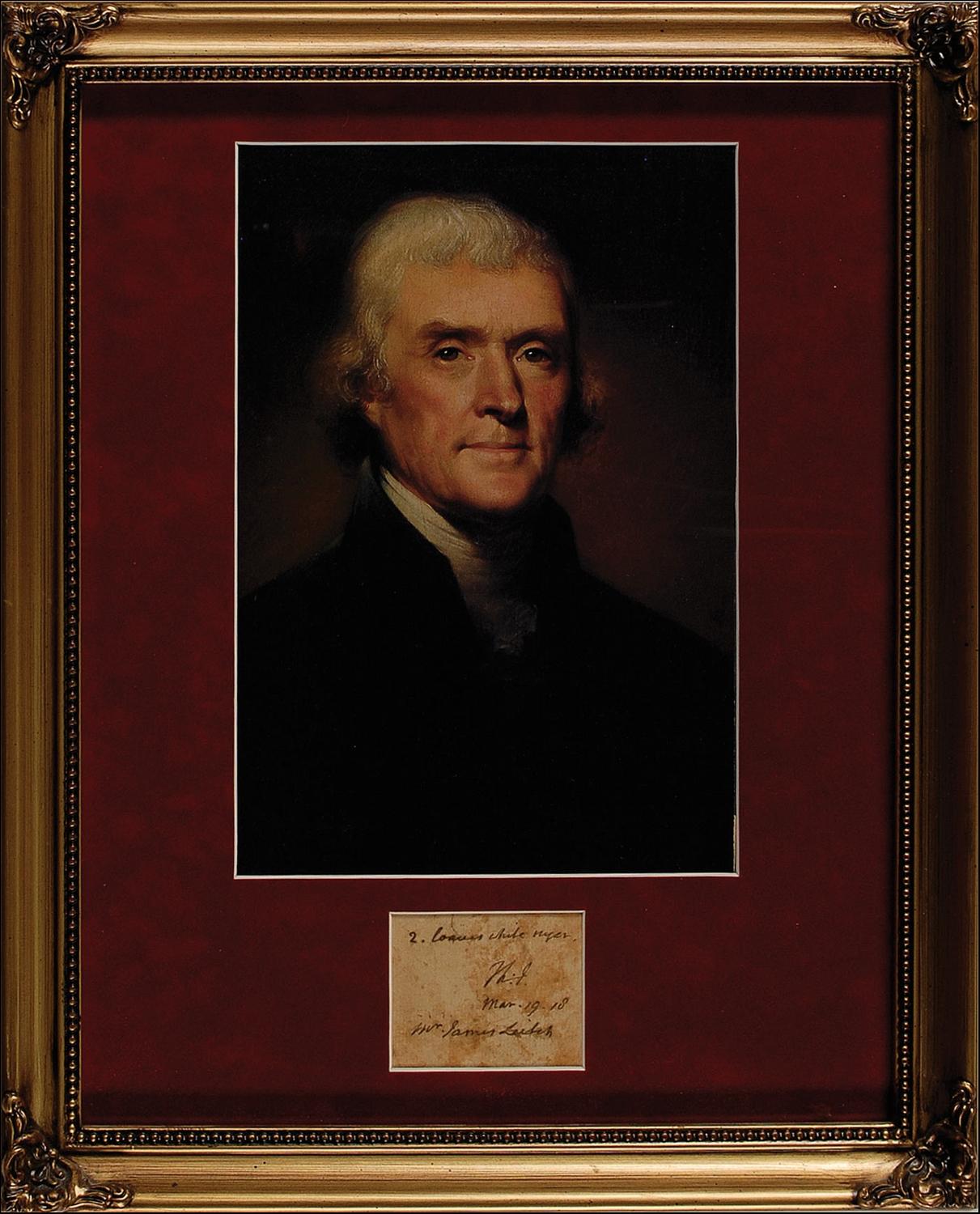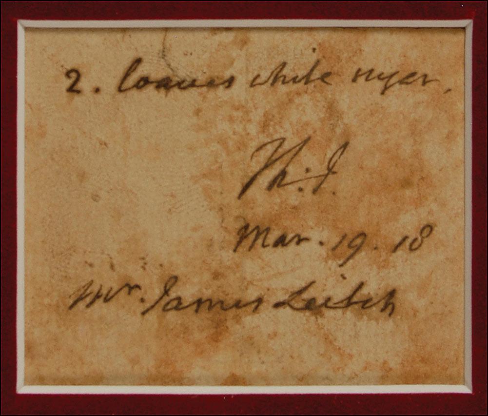 ANS signed “Th: J.,” one page, 2.5 x 2, March 19, 1818. Brief note to a store owner. In full: “2. Loaves white sugar, Mar. 19.18, Mr. James Leitch” Suede matted and framed with a color portrait of Jeffeson, to an overall size of 13 x 16. In very good condition, with scattered moderate toning, some lightly affecting signature, and a few light creases. Leitch was the local store keeper in Charlottesville in Jefferson’s day.
