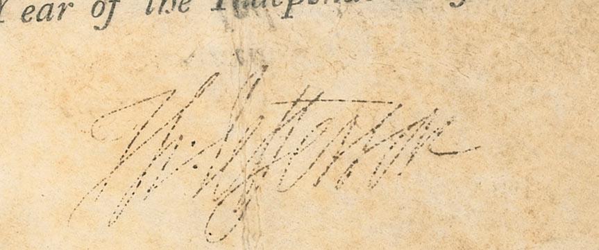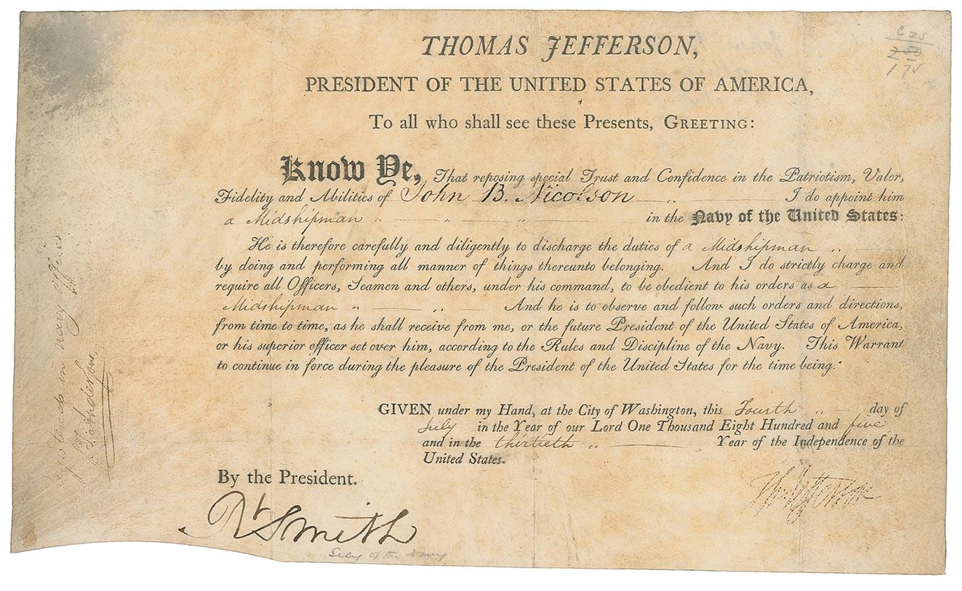 Partly-printed vellum DS, signed “Th: Jefferson,” one page, 13 x 8, July 4, 1805. President Jefferson appoints John B. Nicolson to be “a Midshipman in the Navy of the United States.” Signed at the conclusion by Jefferson and countersigned by Secretary of the Navy Robert Smith. In good condition, with intersecting folds, one through a single letter of signature, skipping to Jefferson’s signature which is fairly light, but still legible, scattered toning and foxing, and a couple of pencil notations.