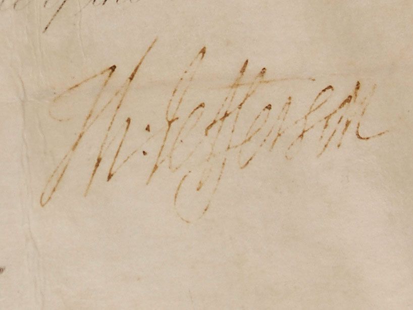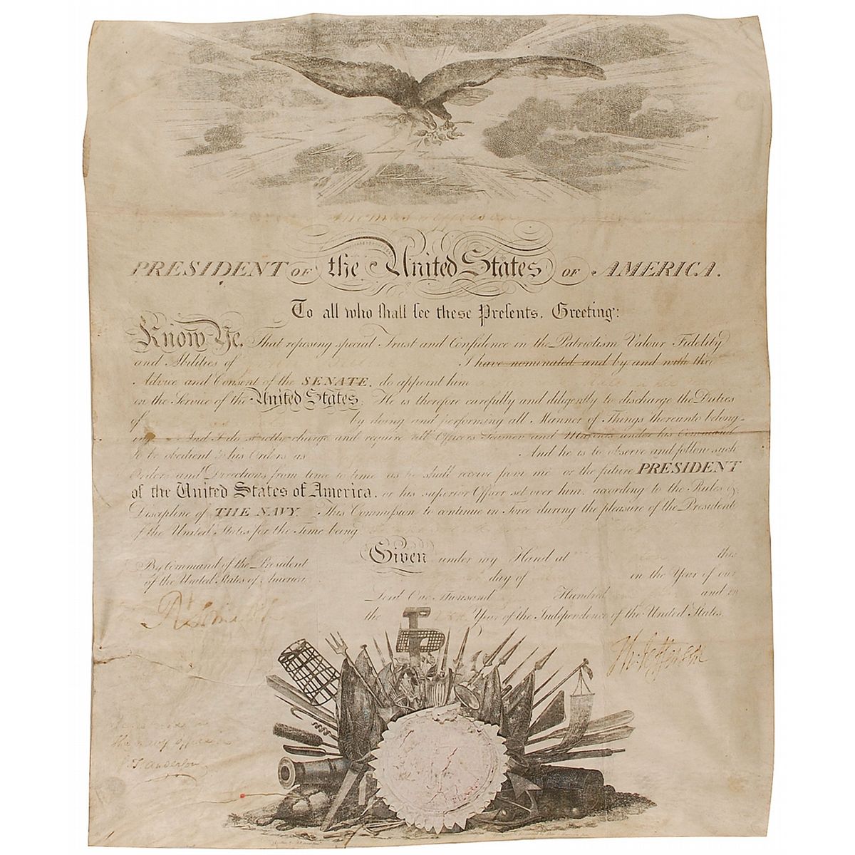 Partly-printed DS as president, signed “Th: Jefferson,” one page, 13.75 x 16.5, May 24, 1804. President Jefferson appoints John Butler “a Surgeon’s Mate in the Navy in the Service of the United States.” The line containing “have nominated and by and with the Advice and Consent of the Senate,” has been crossed out as the Senate was in recess. Signed at the conclusion by Jefferson and countersigned by Secretary of the Navy R. Smith. In good condition, with Smith’s signature light but legible, all handwritten portions of the text very faded and just partly legible, intersecting folds, one passing through a portion of Jefferson’s signature, and scattered creases, wrinkles, and toning. The white paper seal is worn and creased, but mostly intact. Jefferson’s signature remains crisp and legible.
