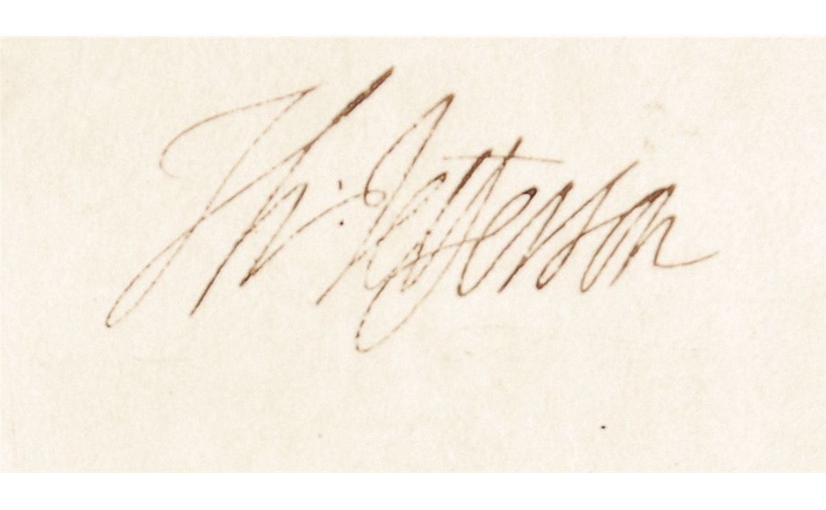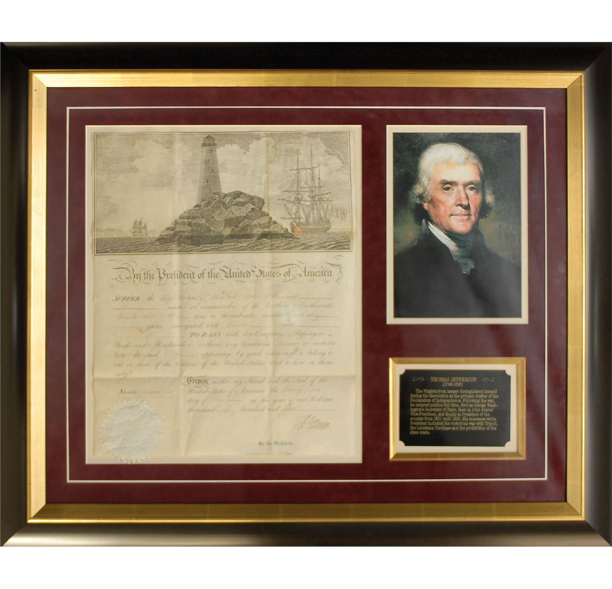 Partly-printed DS as president, signed “Th: Jefferson,” one page, 11.25 x 14.5, May 21, 1803. Ship’s papers issued to the “Brig Neptune of New York, John L. Buswell master and commander…mounted with no guns navigated with eight men to pass with her Company Passengers, Goods and Merchandise without any hindrance, seizure or molestation.” Signed at the conclusion by Jefferson. Double suede matted and framed with a portrait and a biographical plaque to an overall size of 28 x 23.5. Trimmed top and bottom edges, intersecting folds, some light skipping to signature, and handwritten portions of document a shade or two light, but still completely legible, otherwise fine condition. The white paper seal is crisp and intact. A particularly clean and presentable example. Oversized.