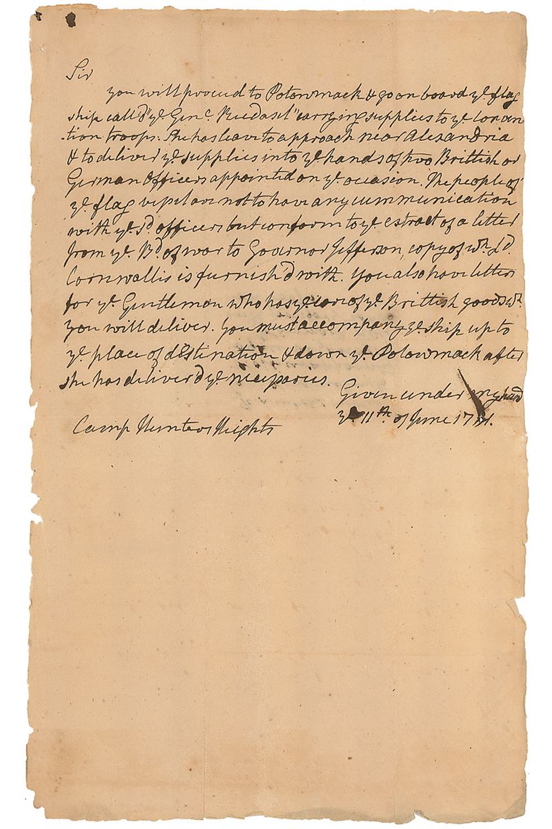 Revolutionary War–dated manuscript letter, one page, 8 x 13.25, June 11, 1781. Letter mentioning Thomas Jefferson and Charles Cornwallis from an unknown person. In part: “You will proceed to Potomack & go on board yr flag ship called ‘ye Genl Breedasil,’ carrying supplies to yr convention troops, she has to leave to approach near Alexandria & to deliver ye supplies into ye hands of two British or German officers…The people of yr flag vessels are not to have any communication with ye officers but conform to ye extract of a letter from ye Bd of War to Governor Jefferson, copy of which Cornwallis is furnished with.” In very good condition, with intersecting folds and chipping to edges. Originates from the papers of George Weedon, an American brigadier general during the Revolutionary War.