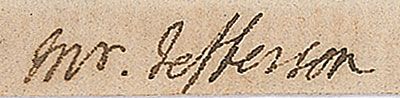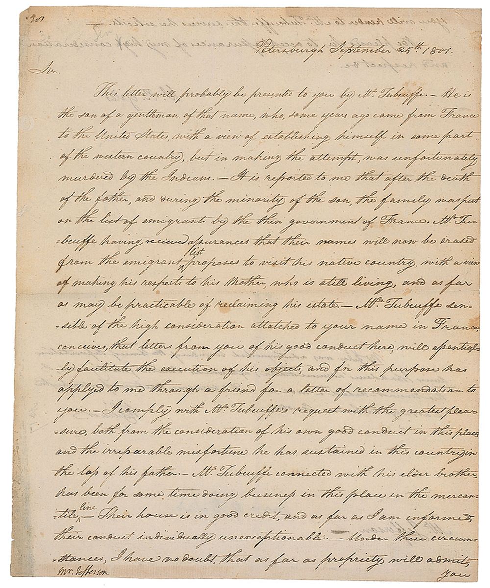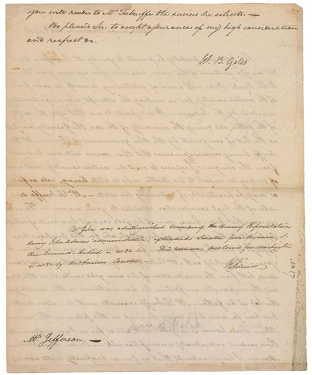 Ink docketing signature as president, “Mr. Jefferson,” at the bottom of a letter sent to him by Congressman William Branch Giles, one page both sides, 7.75 x 9.5, dated September 25, 1801. The letter is an introduction for Mr. Tebeuffe, and reads, in part: “He is the son of a gentleman of that name, who some years ago came from France to the United States, with a view of establishing himself in some part of the western country, but in making the attempt, was unfortunately murdered by the Indians…After the death of the father, and during the minority of the son, the family was put on the list of emigrants by the then government of France [referring to the France’s Revolutionary-era list of political “undesirables” who were considered enemies of the state and were subjected to permanent exile and forfeiture of personal property]. Mr. Tebeuffe having received assurances that their names will now be erased from the emigrant list proposes to visit his native country, with a view of making his respects to his Mother, who is still living, and as far as may be practicable of reclaiming his estate. Mr. Tebeuffe, sensible of the high consideration attached to your name in France, conceives, that letters from you of his good conduct here, will essentially facilitate the execution of his objects.” Giles then goes on to describe Tebueffe and his employment in the mercantile business. In very good to fine condition, with intersecting folds, scattered light stains, primarily to edges and corners, mild toning over Jefferson’s handwriting, a few chips and small separations, and light show-through from writing on reverse. Jefferson earned the “high consideration” of the French government during his tenure as Minister to France from 1785 to 1789, during which time he lived in a house on the Champs Élysées in Paris.