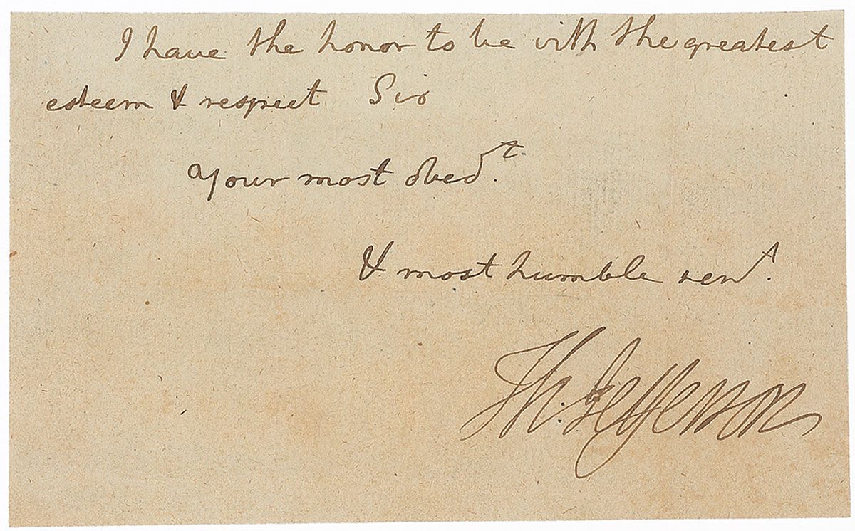 Conclusion of an ALS signed “Th: Jefferson,” one page, 5 x 3.25, no date. A self-contained closing clipped from a longer letter reads, in full: “I have the honor to be with the greatest esteem & respect Sir, Your most obedt. & most humble sevt., Th: Jefferson.” In fine condition, with several intersecting folds, one through a single letter of signature, and a bit of mild toning. A crisply-penned and highly presentable example.