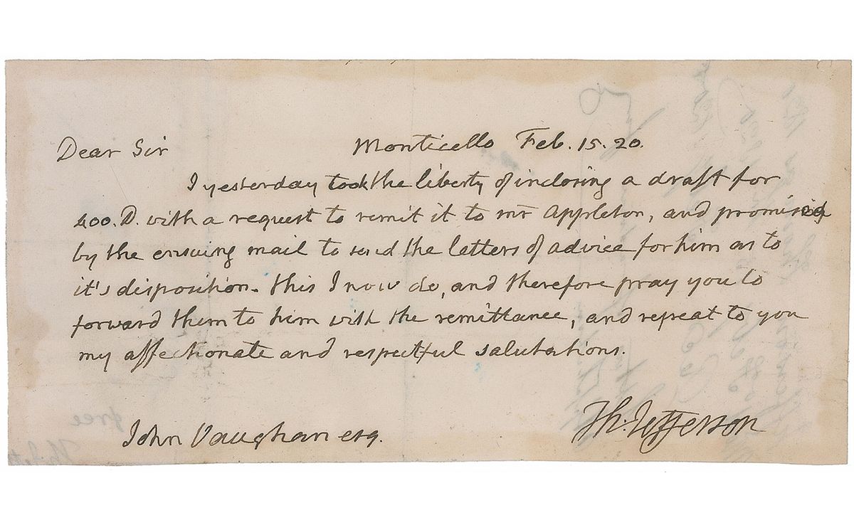Boldly penned ALS signed “Th: Jefferson,” one page, 7.75 x 3.5, February 15, 1820. Letter to John Vaughan. In full: “I yesterday took the liberty of inclosing a draft for 400.D. with a request to remit it to Mr Appleton, and promised by the ensuing mail to send the letters of advice for him as to it’s [sic] disposition. This I now do, and therefore pray you to forward them to him with the remittance, and repeat to you my affectionate and respectful salutations.” Letter has been removably encapsulated in Mylar. Reverse is docketed and bears a partial cut-off franking signature to lower right. Intersecting folds, show-through from docketing on reverse, and light toning to borders, otherwise fine condition. After the sculptors’ wives declined to make the journey, Michele and Giacomo Raggi wished to back out of their contract to carve the Ionic and Corinthian capitals for the University of Virginia campus. A fine letter epitomizing Jefferson’s love of architecture and commitment to the University of Virginia.