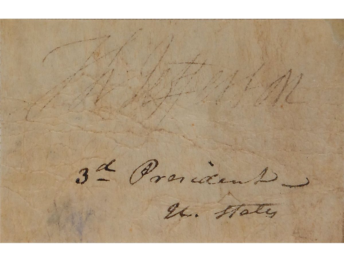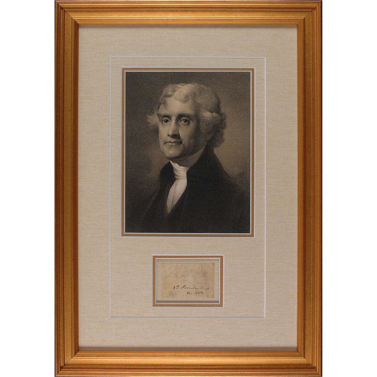 Ink signature, “Th: Jefferson,” on an off-white 2.75 x 2 slip, with an ink notation under signature in an unknown hand. Archivally triple-cloth-matted and framed with a portrait of Jefferson to an overall size of 14 x 20. In good condition, with Jefferson’s signature very light, but still mostly legible, and moderate creases and wrinkling.