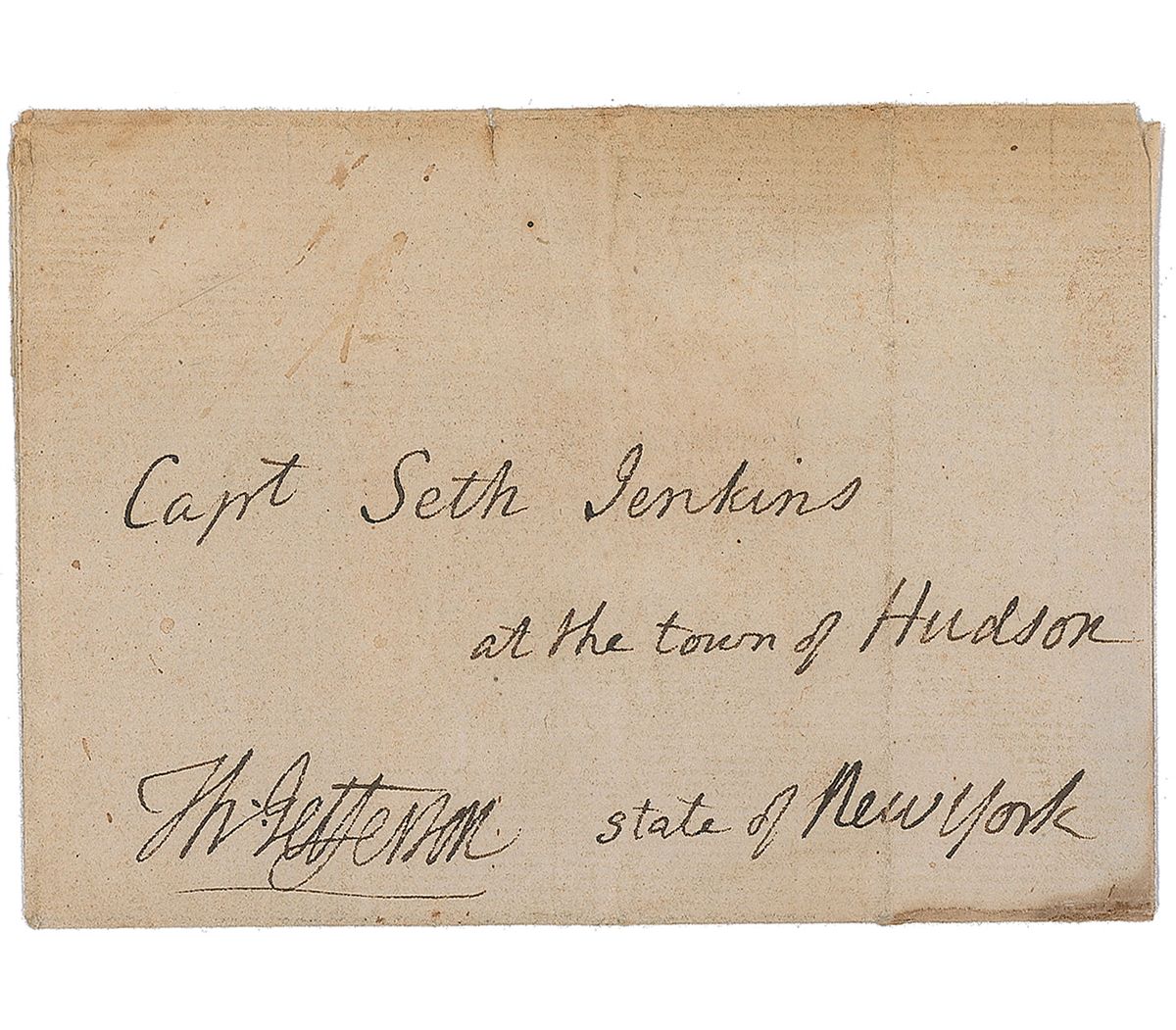 Exceptional full free frank, measuring 9 x 7.5 unfolded, with center panel measuring 4.5 x 3.25, addressed by Jefferson to “Capt. Seth Jenkins, at the town of Hudson, state of New York,” and crisply franked in the lower left, “Th: Jefferson.” In fine condition, with a few trivial stains to the address panel and a couple larger stains to adjacent panels. Jenkins was a Nantucket whaler who founded the whaling port of Hudson, New York, and later became a wine distiller. The National Archives has one record of a letter from Jefferson to Jenkins, dated June 21, 1791, in which he tells Jenkins that he should look into distilling spirits from wine rather than molasses, believing that it could create a higher quality product at a decreased cost. In arguing that better and cheaper spirits could be produced from wine than from molasses, Jefferson hoped to lessen American dependence upon the British West Indies and to increase trade relations with France. An extraordinarily desirable free frank, bearing a particularly bold and unusually large signature.