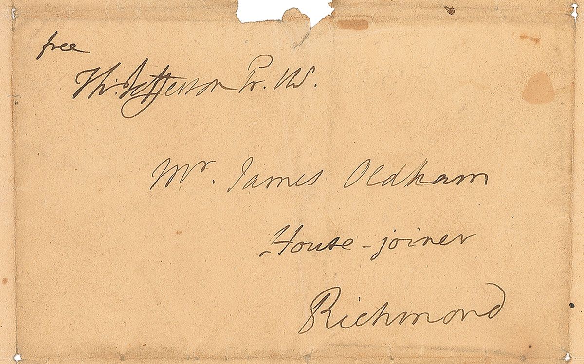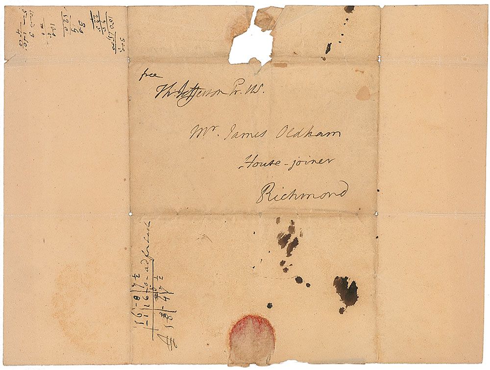 Scarce full free frank as president, measuring 9.75 x 7.25 unfolded, with center panel measuring 5 x 3, addressed by Jefferson to “Mr. James Oldham, House-joiner, Richmond,” and crisply franked in the upper left, “free, Th: Jefferson Pr. US.” Originally sent on August 30, 1807, this contained a letter to Oldham regarding payment for his work; calculations to the blank panels were most likely made by Oldham to figure out the bill. Scattered creases, a few small stains and stray ink blots to blank panels, and an expected area of paper loss from the seal to the upper blank panel, otherwise fine condition. Accompanied by a color photocopy of the letter sent to Oldham. James Oldham was a joiner at Monticello from 1801 to 1804, where he crafted exterior woodwork for Jefferson’s expanded Monticello II; after moving to Richmond in 1805, he supplied Jefferson with materials for the main house, such as venetian blinds for the greenhouse, sashes for the Southeast Portico, paneled doors, mortise locks, glass, and mahogany planks.