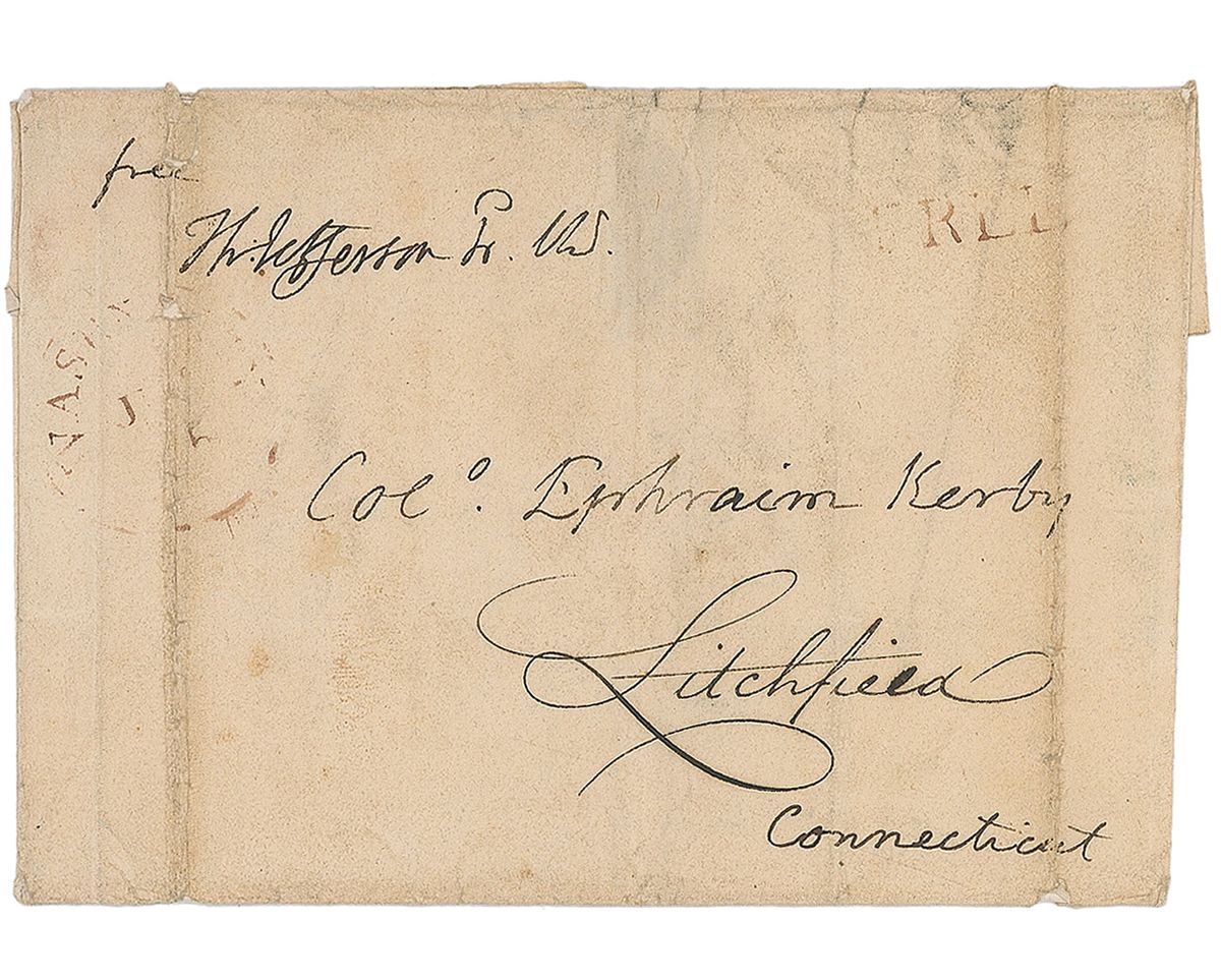Full hand-addressed free frank, measuring 9.75 x 8.25 unfolded, with panel measuring 5.25 x 3.5, addressed in another hand to “Colo. Ephraim Kirby, Litchfield, Connecticut,” and franked in the upper left, “Free Th: Jefferson, Pr. U.S.” Lower portion is docketed by the recipient and dated July 15, 1803, and the panel also bears a light Washington and ‘Free’ stamp. In very good to fine condition, with two vertical folds to panel, some paper loss to far edge from wax seal, and scattered light toning and soiling.