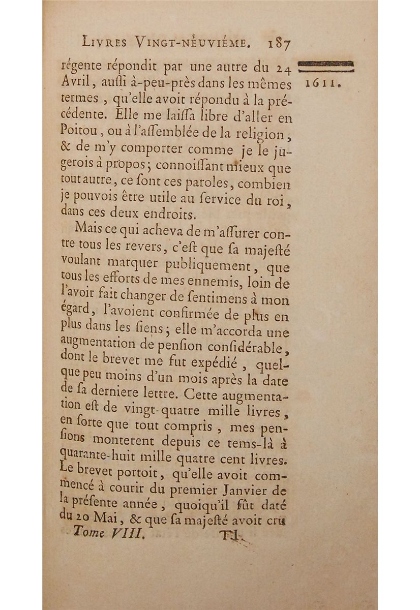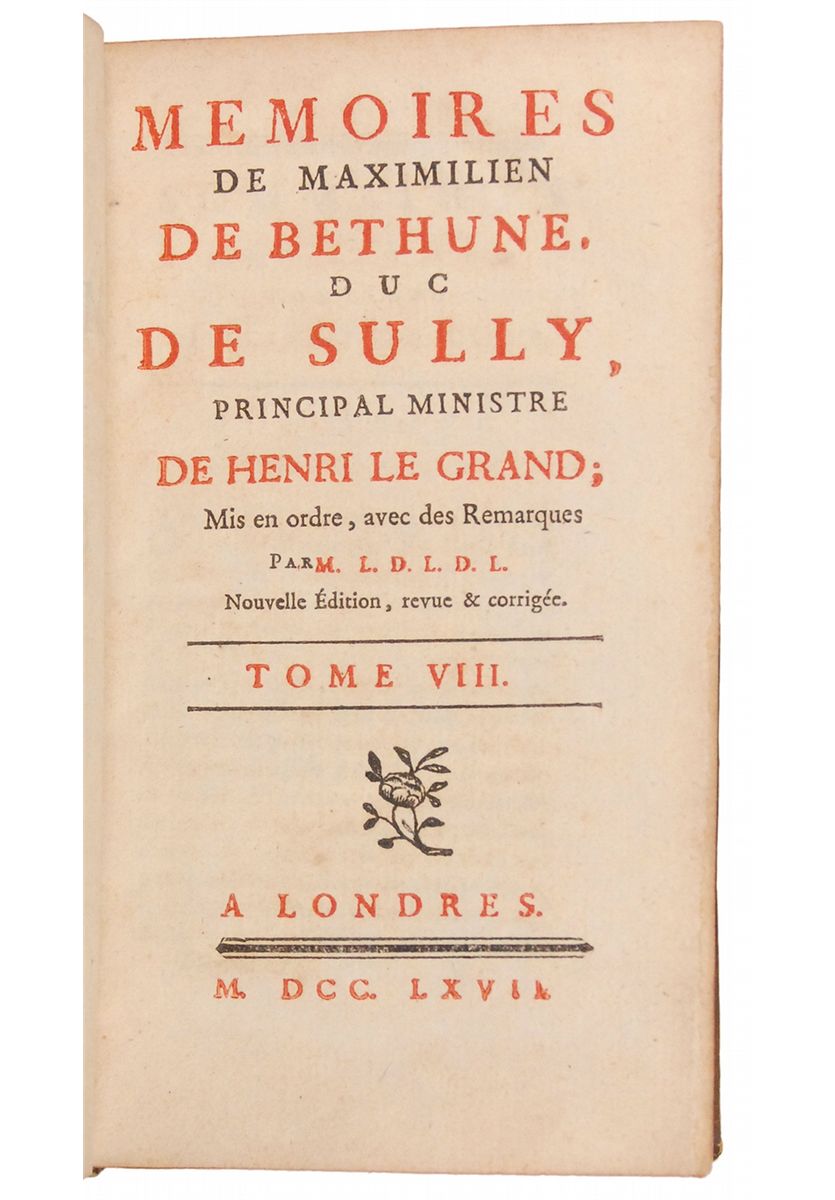 Memoires de Maximilien de Bethune, duc de Sully, principal ministre de Henri le Grand, Vol. 8. Nouvelle Edition. Londres, 1767. Bound in contemporary French mottled calf gilt, morocco spine labels, 4 x 6.75, 375 pages. Signed with his ownership initial, “T,” beside the printed binder’s signature mark, “I,” at the bottom of page 187 (Jefferson’s typical style of ownership signature used in books from his library in which he substituted “I” for “J”). In very good condition, with bindings worn and cracked at joints, occasional minor fox marks, and some light tanning.