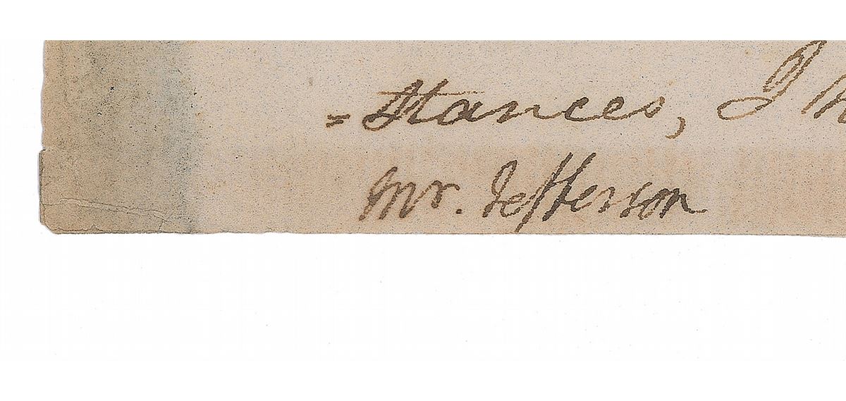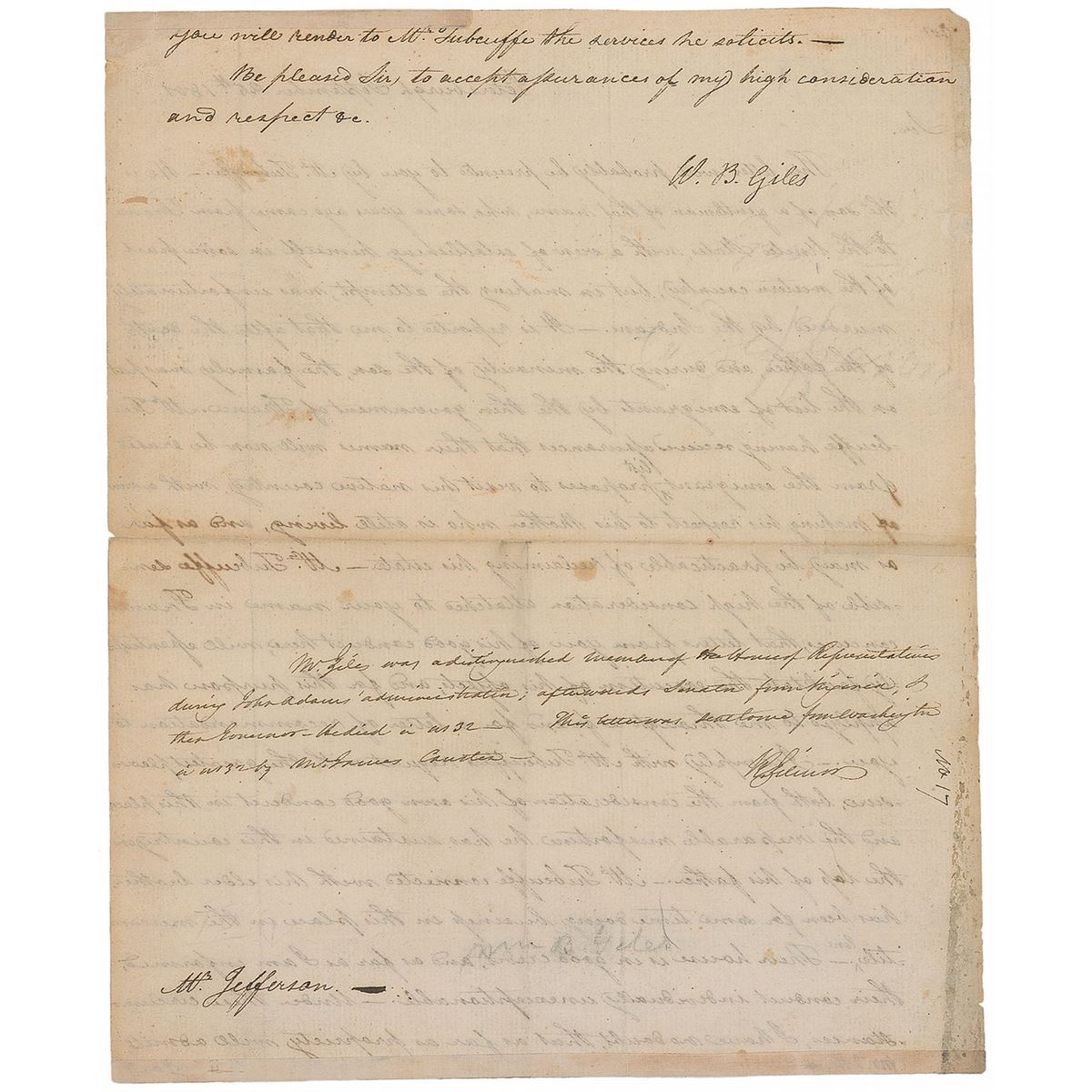 Docketing signature, “Mr. Jefferson,” in the bottom margin of a letter sent to him by Congressman William Branch Giles, one page both sides, 7.75 x 9.5, September 25, 1801. The letter, an introduction for a Mr. Tubeuffe, in part: “He is the son of a gentleman of that name, who some years ago came from France to the United States, with a view of establishing himself in some part of the western country, but in making the attempt, was unfortunately murdered by the Indians….After the death of the father, and during the minority of the son, the family was put on the list of emigrants by the then government of France [referring to the France’s Revolutionary–era list of political 'undesirables' who were considered enemies of the state and were subjected to permanent exile and forfeiture of personal property]. Mr. Tubeuffe having received assurances that their names will now be erased from the emigrant list proposes to visit his native country, with a view of making his respects to his Mother, who is still living, and as far as may be practicable of reclaiming his estate. Mr. Tubeuffe sensible of the high consideration attached to your name in France, conceives, that letters from you of his good conduct here, will essentially facilitate the execution of his objects.” Giles then goes on to describe Tubeuffe and his employment in the mercantile business. In very good condition, with a few light scattered spots and soiling, mild toning to area of signature, and a few tiny chips and tears. Jefferson earned this "high consideration" of the French government during his tenure as minister to France from 1785 to 1789, during which time he lived in a house on the Champs Elysees in Paris. Jefferson’s signature, though small, is dark and distinct.