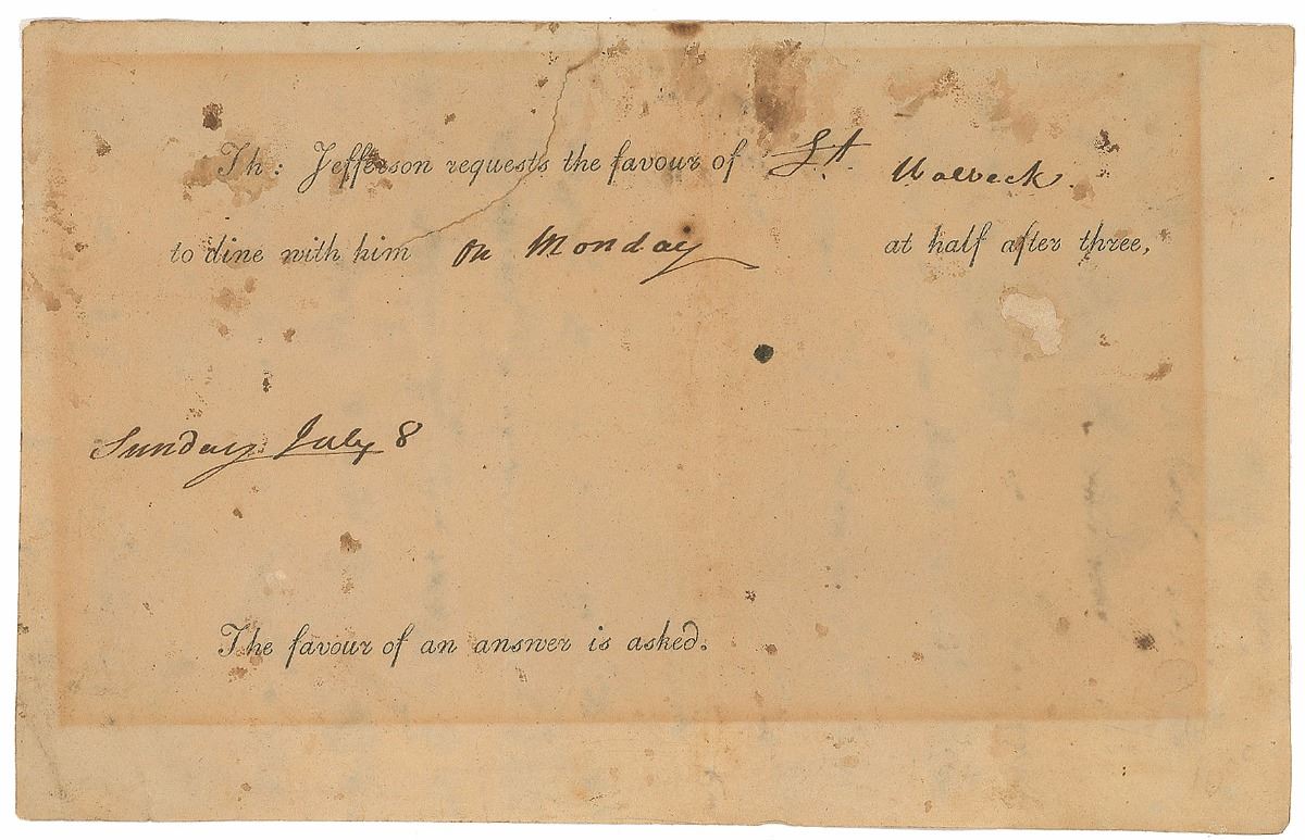 Partly-printed invitation filled out in another hand, unsigned, one page, 7.5 x 4.75, July 8, [no year]. In part: “Th: Jefferson requests the favour of Lt. Holveck to dine with him on Monday at half after three.” Scattered staining and soiling, a few repaired tears and holes, and a uniform block of toning, otherwise very good condition.