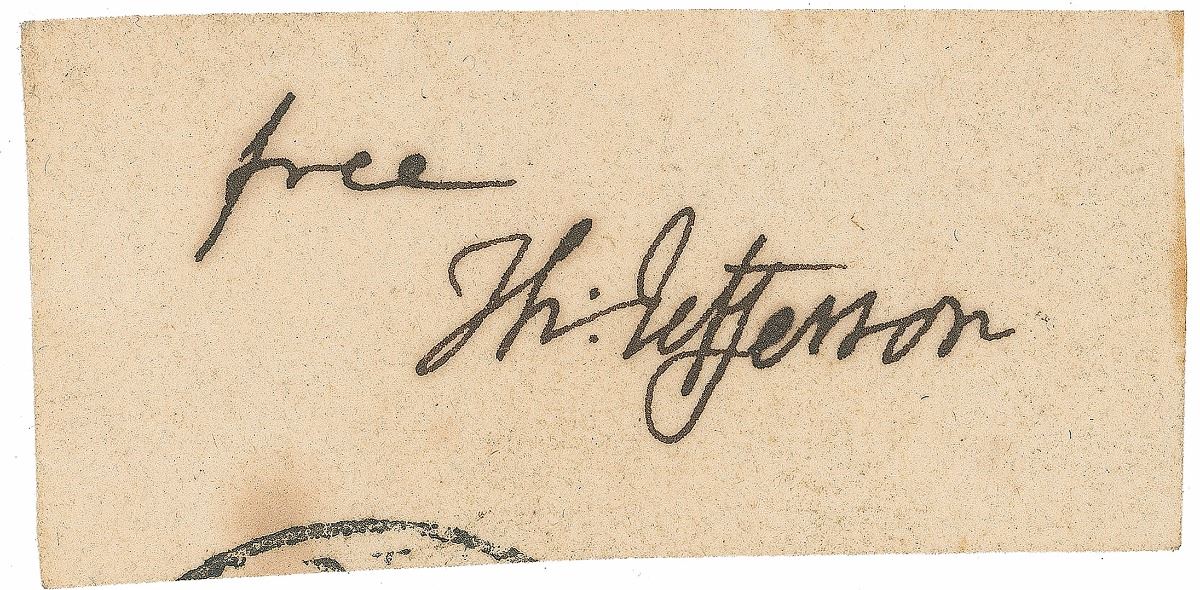 Bold franking signature, “Free, Th: Jefferson,” on an off-white 2.25 x 1 slip clipped from a free frank panel. In fine condition. A supremely attractive example.