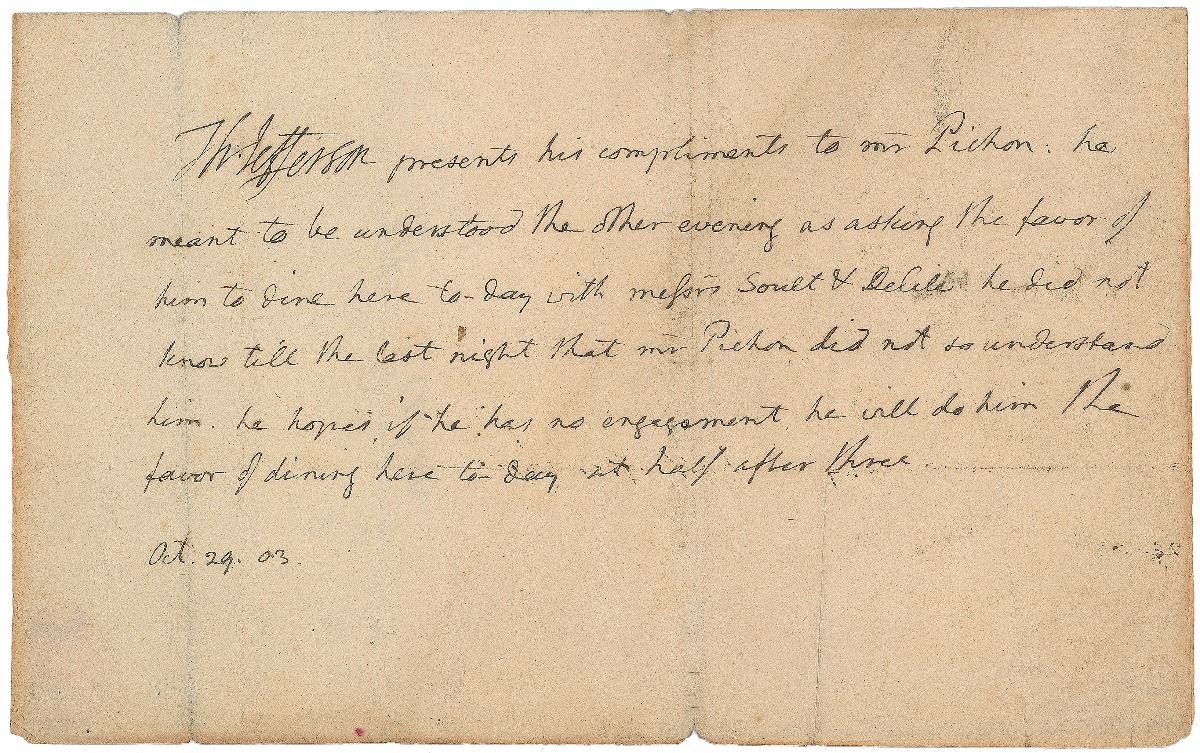 Third-person ALS as president signed “Th: Jefferson,” one page, 8 x 5, October 29, 1803. In full: “Th: Jefferson presents his compliments to Mr. Pichon. He meant to be understood the other evening as asking the favor of him to dine here to-day with Messrs Soult & Delile. He did not know till last night that Mr. Pichon did not so understand him. He hopes if he has no engagement he will do him the favor of dining here today at half after three.” Second integral page bears an address panel in Jefferson’s hand, “Mr. Pichon.” In very good to fine condition, with several intersecting folds.