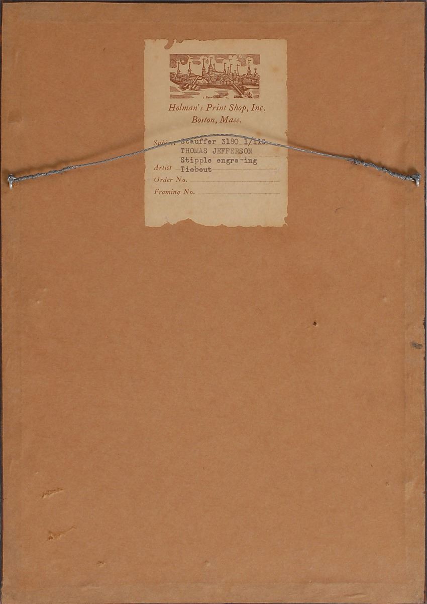 Handsome stipple engraving by Tiebout, 6.75 x 10, captioned, “Thomas Jefferson, Vice President of the U. S.” Published by “D. Kennedy, No. 228 Market St.” Framed and in fine condition. Originally purchased from Holman’s Print Shop in Boston and retains the label on the reverse.