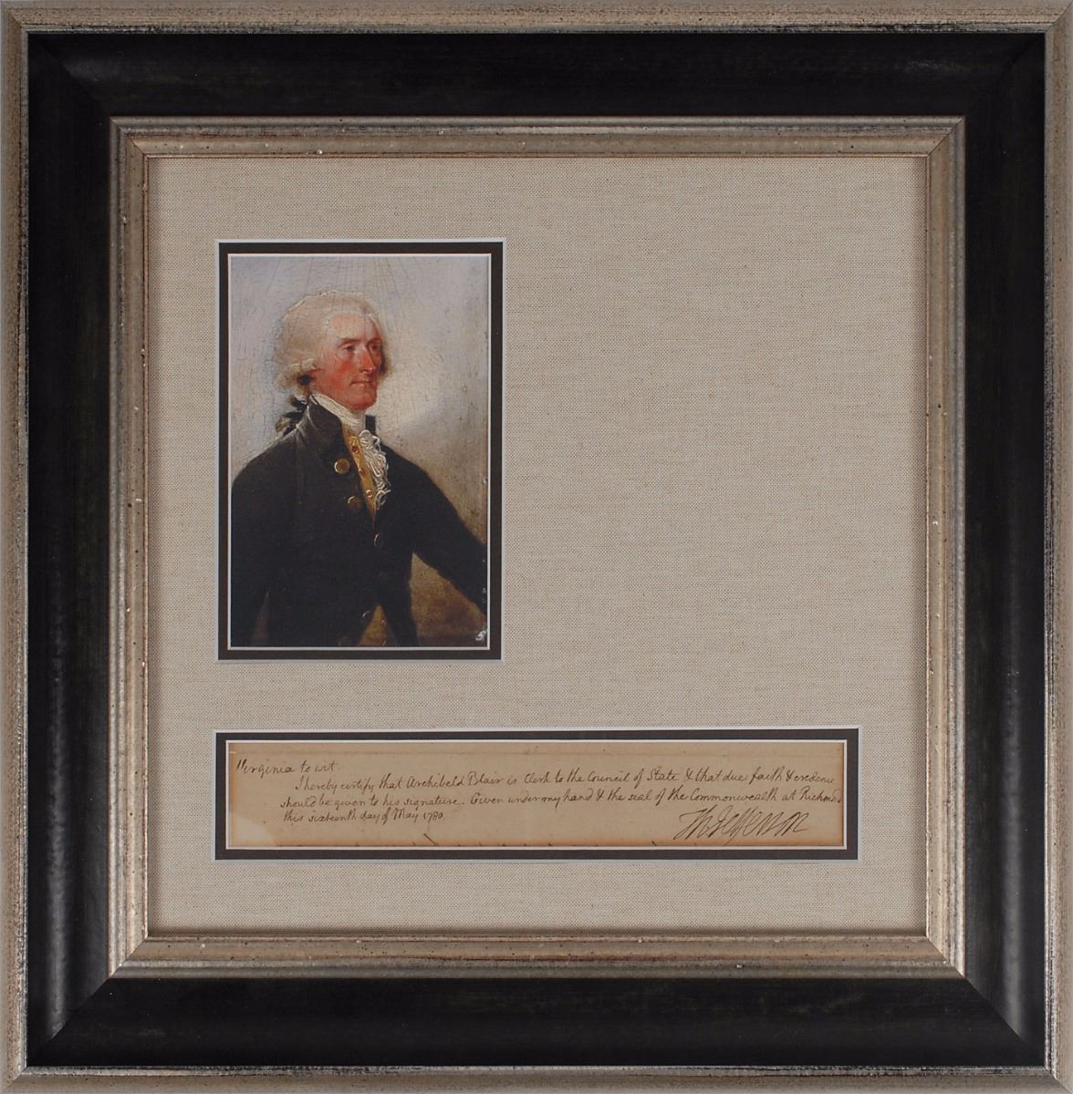 Revolutionary War–dated ADS, signed “Th: Jefferson,” one page, 11.5 x 1.75, May 16, 1780. Exceptional official document entirely in Jefferson’s hand, in full: “Virginia to wit: I hereby certify that Archibald Blair is clerk to the Council of the State & that due faith & credence should be given to his signature. Given under my hand & the seal of the Commonwealth at Richmond this sixteenth day of May 1780.” Cloth-matted and framed with an image to an overall size of 20 x 19. Overall toning and repaired paper loss to the lower left corner, otherwise fine condition.