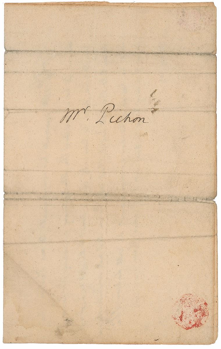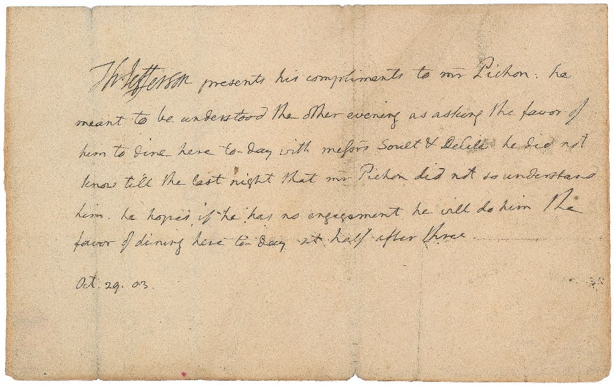 Third-person ALS as president signed “Th: Jefferson,” one page, 8 x 5, October 29, 1803. In full: “Th: Jefferson presents his compliments to Mr. Pichon. He meant to be understood the other evening as asking the favor of him to dine here to-day with Messrs Soult & Delile. He did not know till last night that Mr. Pichon did not so understand him. He hopes if he has no engagement he will do him the favor of dining here today at half after three.” Second integral page bears an address panel in Jefferson’s hand, “Mr. Pichon.” In very good to fine condition, with several intersecting folds. Accompanied by a copy of Manuscripts, Vol. 68, No. 1 (Winter 2016), which includes an article by Douglass F. Rohrman entitled ‘Invitation to Dine with Thomas Jefferson,’ detailing the events leading up to the Jefferson–Pichon dinner date and showing an image of the letter.