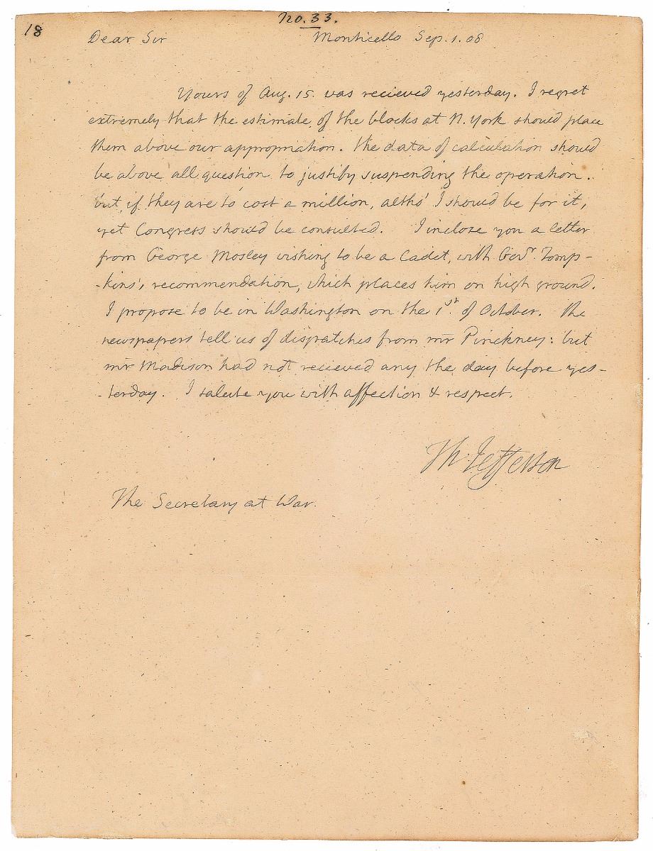 ALS as president signed “Th: Jefferson,” one page, 7.25 x 9.5, September 1, 1808. Letter to “The Secretary at War,” Henry Dearborn. In part: “I regret extremely that the estimate of the blocks at N. York should place them above our appropriation. The data of calculation should be above all question to justify suspending the operation. But, if they are to cost a million, altho’ I should be for it, yet Congress should be consulted. I inclose you a letter from George Mosley wishing to be a Cadet, with Govr. Tompkins’s recommendation, which places him on high ground. I propose to be in Washington on the 1st. of October. The newspapers tell us of dispatches from Mr. Pinckney: but Mr. Madison had not received any the day before yesterday. I salute you with affection & respect.” Professionally cleaned, backed, and extensively restored to fine condition.