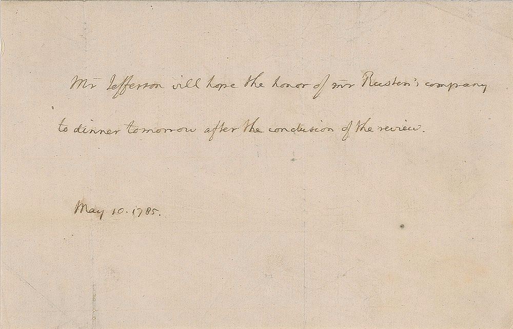 Third-person ALS, signed within the text, "Mr. Jefferson," one page, 6.75 x 4.25, May 10, 1785. In full: "Mr. Jefferson will hope the honor of Mr. Rusten's company to dinner tomorrow after the conclusion of the review." Addressed on the reverse of the second integral page by Jefferson, "A Mons, Mons'r Rusten, Hotel d'Orleans, Palais Royale." Professionally cleaned, backed, and restored to fine condition. Jefferson would be presented as the new United States Minister to France just seven days later on May 17, 1785, filling the post of the resigned Benjamin Franklin.