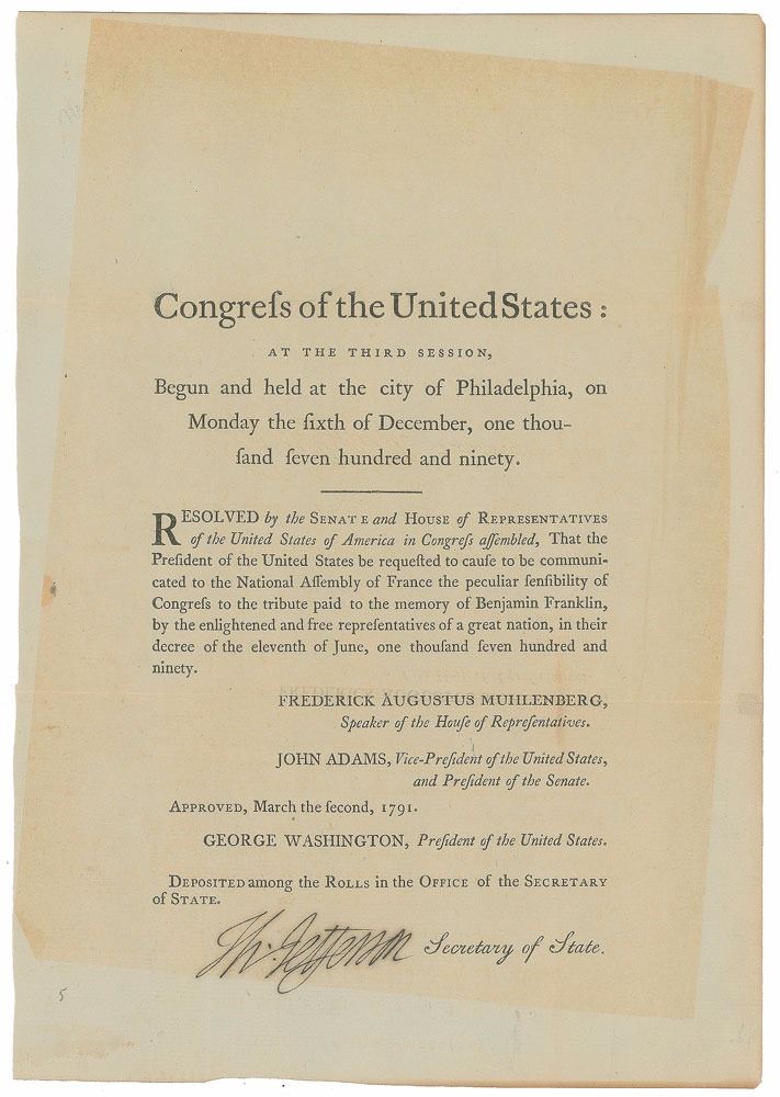 DS, signed “Th: Jefferson,” one page, 7.25 x 10.5, March 2, 1791. Printed Congressional resolution approved by President George Washington on March 2, 1791, in full: "Resolved by the Senate and House of Representatives of the United States of America in Congress assembled, That the President of the United States be requested to cause to be communicated to the National Assembly of France the peculiar sensibility of Congress to the tribute paid to the memory of Benjamin Franklin, by the enlightened and free representatives of a great nation, in their decree of the eleventh of June, one thousand seven hundred and ninety." Prominently signed at the conclusion by Secretary of State Thomas Jefferson, certifying that the act has been "deposited among the Rolls in the Office of the Secretary of State." In fine condition, with trimmed edges, intersecting folds, and an askew block of light toning.