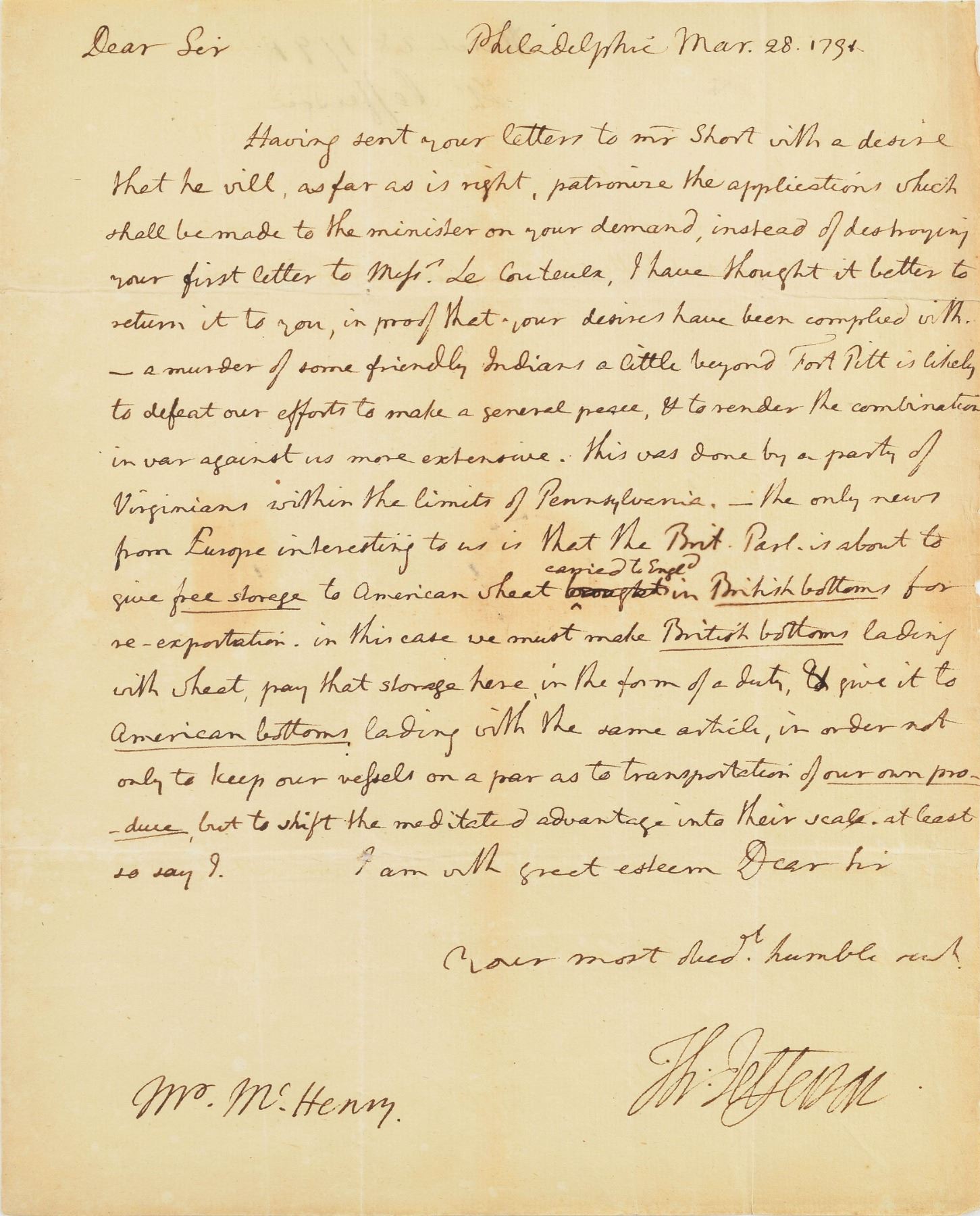 Before his election to the Senate in the fall of 1791, Maryland signer James McHenry served in the state Assembly and was actively engaged in the mercantile business. Although a staunch Federalist, McHenry shared many of Jefferson’s views on issues both domestic and foreign. After mentioning the murder of Indians and predicting the ramifications of the crime, Secretary Jefferson turns his attention to news abroad and reports on wheat export with England, suggesting a duty to balance what is being proposed by British Parliament. A phenomenal, cleanly penned letter rife with content significant to the growth of America.