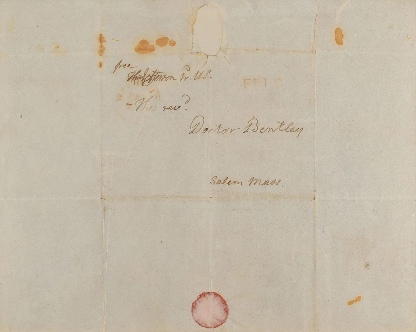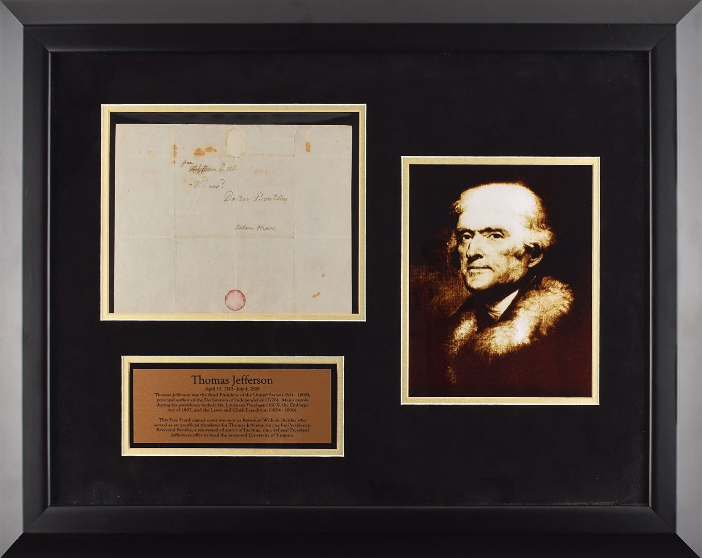Desirable full free frank, measuring 9.75 x 7.75 unfolded with a center panel of 4.75 x 3.25, boldly addressed in Jefferson's hand to "The Rev'd Doctor Bentley, Salem, Mass.," and franked in the upper left, "free, Th: Jefferson, Pr. US." The panel features a Washington postmark and 'Free' stamp, with lower portion retaining original wax seal. Double-matted and framed with an information plate and large portrait to an overall size of 29 x 23. In very good to fine condition, with scattered small stains, and professional repairs to the seal-related paper loss and associated tear which passes just to the right of Jefferson's signature. Reverend William Bentley (1759–1819) was an American Unitarian minister and polymath who possessed the second best library in the United States, after that of Thomas Jefferson. He served as the unofficial translator for Jefferson during his presidency and twice declined Jefferson's offers of prominent positions, first as chaplain of the United States Congress, and then as first president of the University of Virginia.