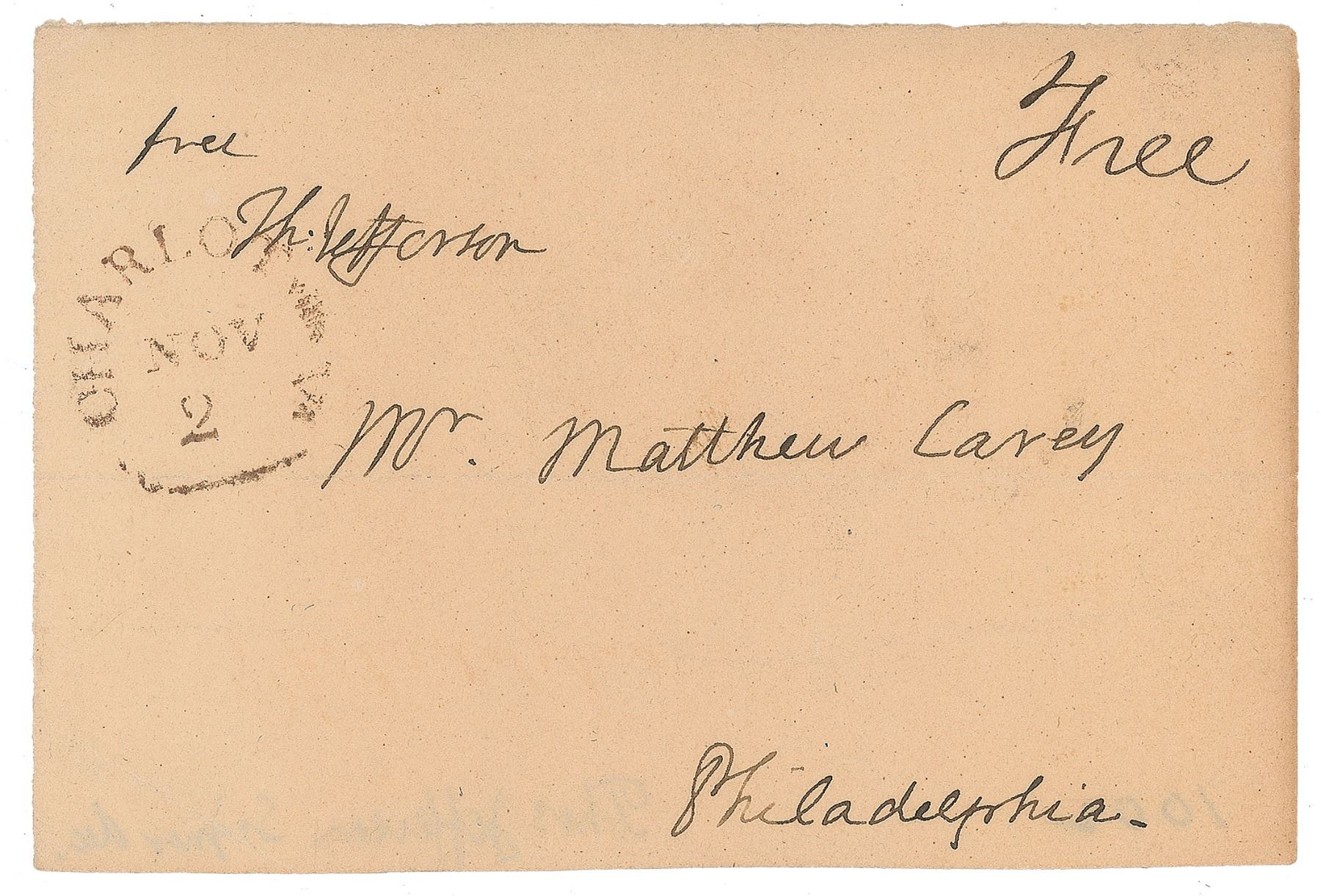 Hand-addressed and free franked address panel, 4.75 x 3.25, addressed in Jefferson's hand to "Mr. Matthew Carey, Philadelphia," and franked in the upper left, "free, Th: Jefferson." Postmarked at Charlotte, VA, November 2, [no year]. In fine condition, with faint show-through along the bottom edge from a notation on the reverse.