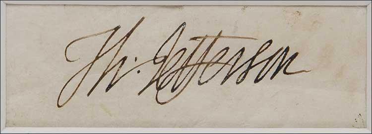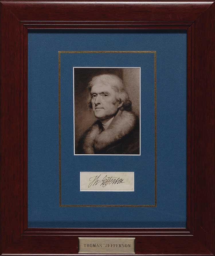 Bold and crisp ink signature, “Th: Jefferson,” on an off-white slip. Matted and framed with a portrait of Jefferson, to an overall size of 10.5 x 12.25. In fine condition, with a trivial crease through a single letter of signature, and some light wrinkling. Pre-certified John Reznikoff/PSA/DNA and RRAuction COA.