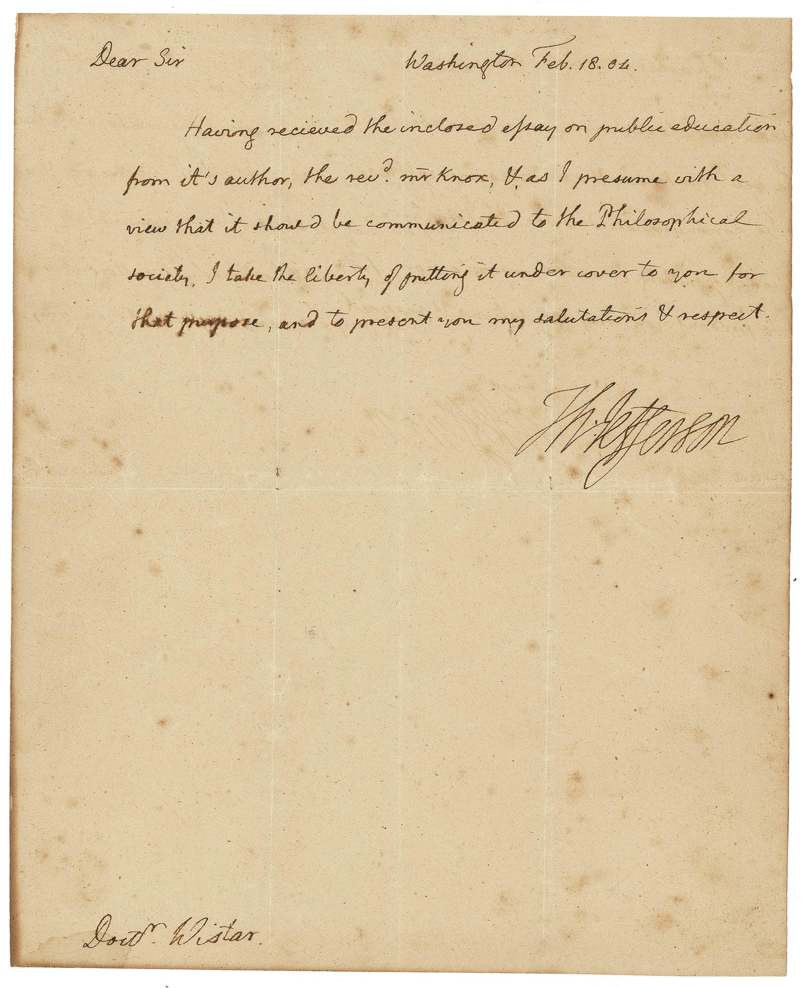 ALS as president signed “Th: Jefferson,” one page, 8 x 9.75, February 18, 1804. Jefferson writes to Dr. Casper Wistar, in full: “Having recieved [sic] the inclosed [sic] essay on public education from it’s [sic] author, the revd Mr. Knox, &, as I presume with a view that it should be communicated to the Philosophical society, I take the liberty of putting it under cover to you for that purpose, and to present you my salutations & respect.”