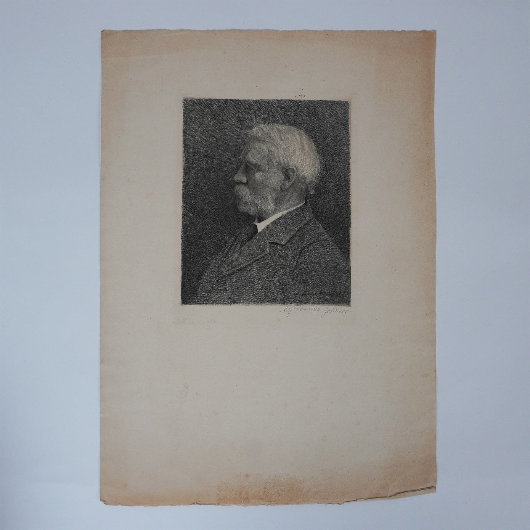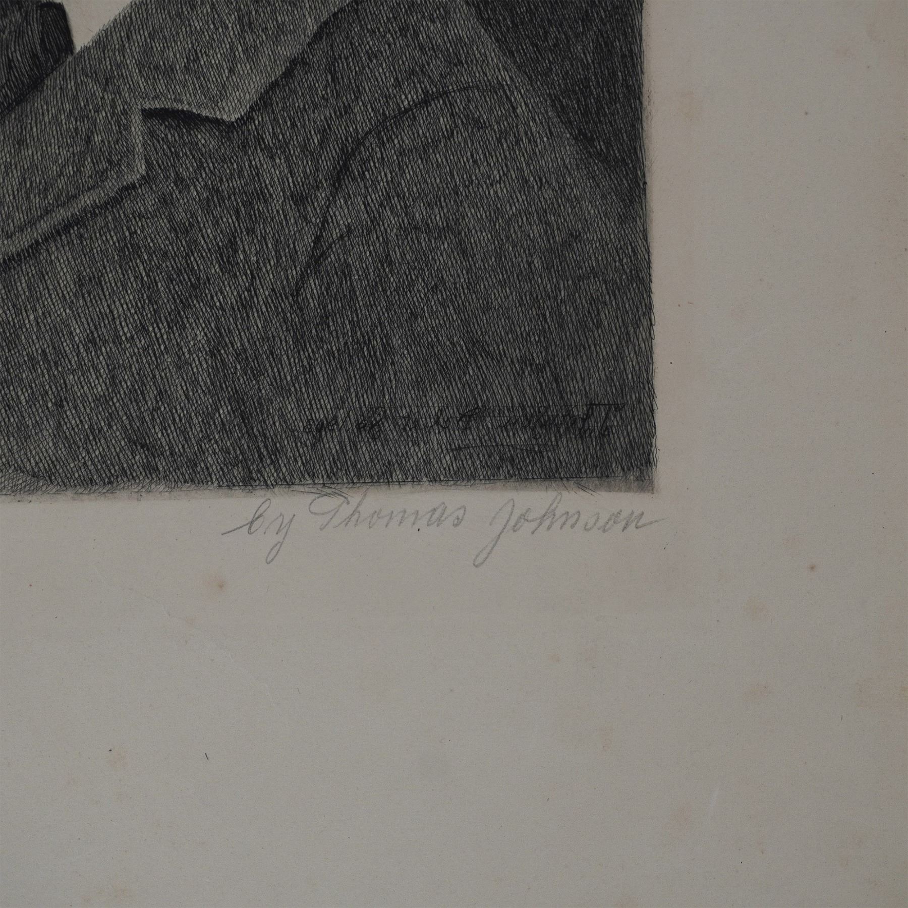 A finely detailed engraving by Thomas Johnson, depicting a distinguished gentleman in profile. The artwork showcases Johnson’s expert craftsmanship and attention to detail, with intricate cross-hatching and textural precision. Measuring 14"L x 20"H, this piece is rendered on paper and is signed in pencil by the artist below the image. Ideal for collectors of fine engravings and 19th-century art.