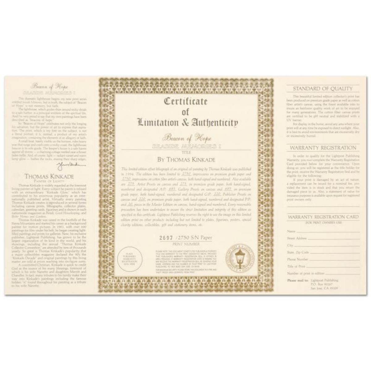 "Beacon of Hope" is an offset lithograph on paper by Thomas Kinkade (1958-2012), numbered 2697/2750 and hand signed by the artist. Includes Certificate of Authenticity from Lighthouse Publishing. Measures approx. 30" x 22" (border), 26.5" x 17" (image). Reference #: 235264