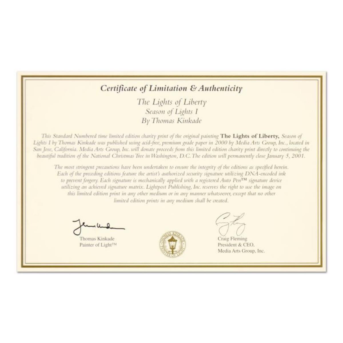 "Lights of Liberty" is an offset lithograph on paper by Thomas Kinkade (1958-2012), numbered and hand signed by the artist. Includes Certificate of Authenticity from Lighthouse Publishing. Measures approx. 20" x 16" (border), 16" x 12" (image). Reference #: 235279.