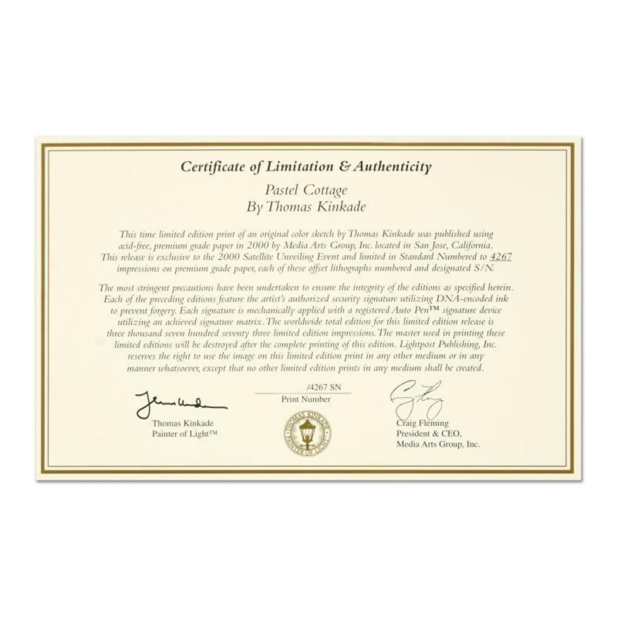 "Pastel Cottage" is an Offset Lithograph on paper by Thomas Kinkade (1958-2012), numbered and bearing Kinkade's authorized signature. Includes Letter of Authenticity from Lighthouse Publishing. Measures approx. 20" x 16" (border), 16" x 12" (image). Reference #: 235784.