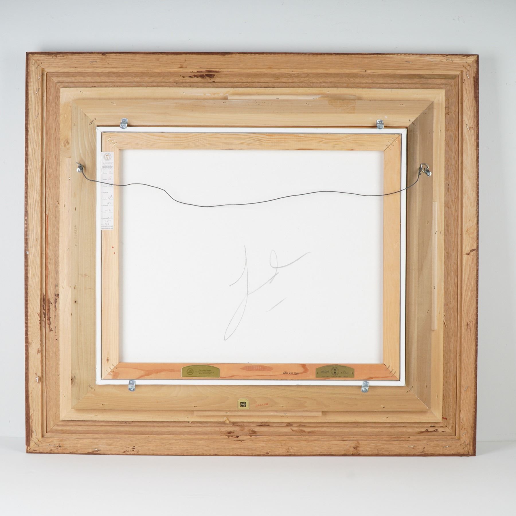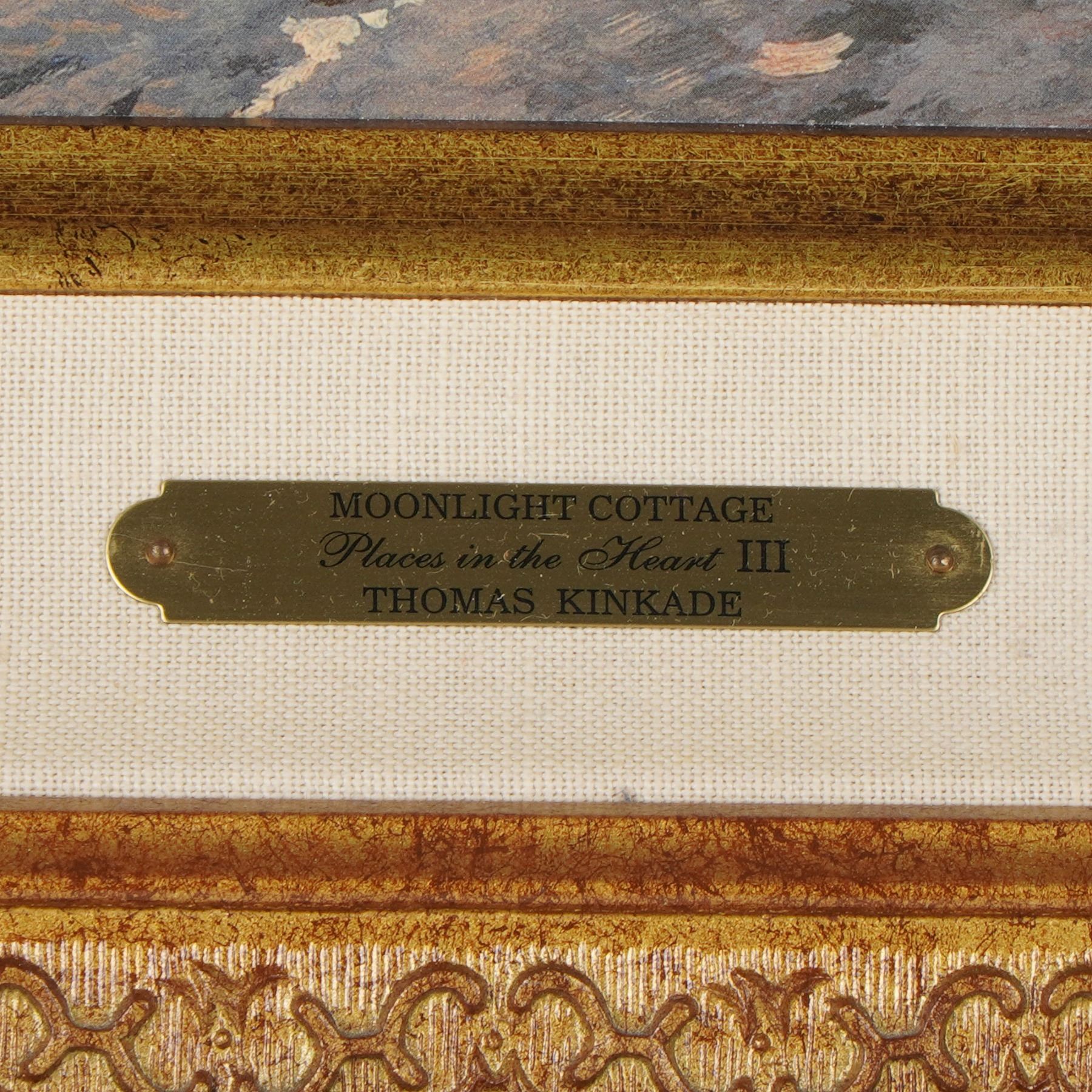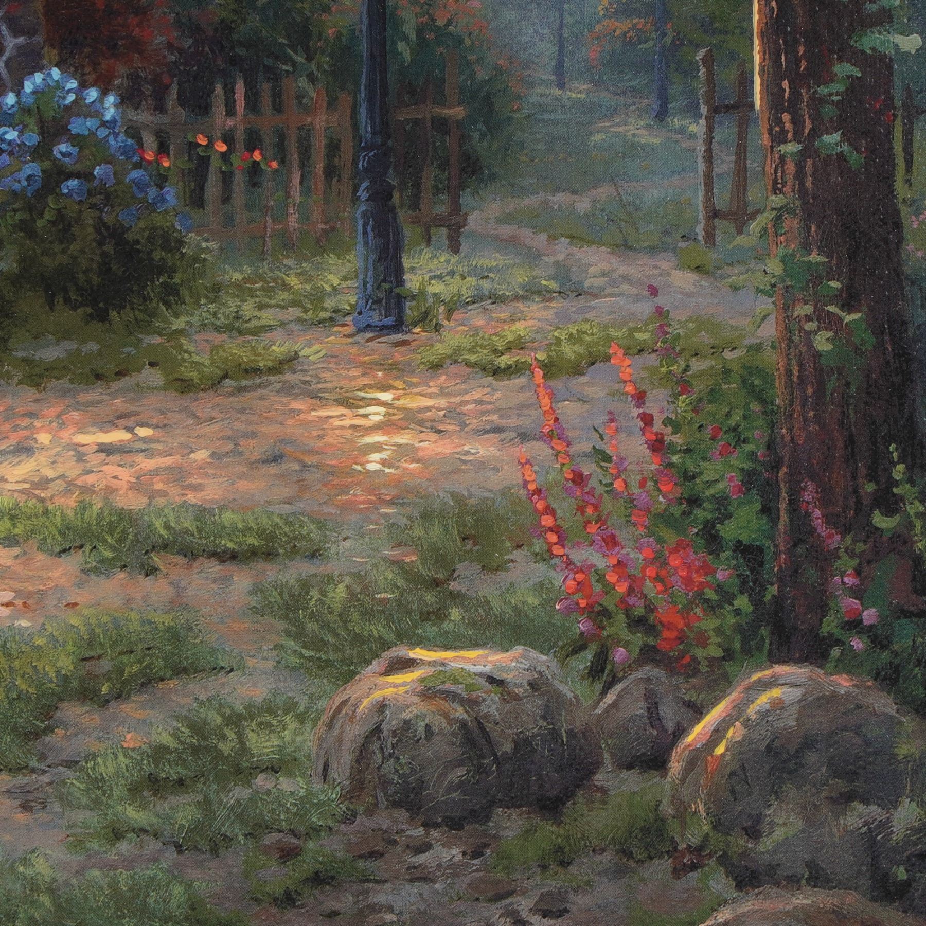 A quintessential example of Thomas Kinkade's luminous artistry, Moonlight Cottage captures the artist's signature Painter of Light serenity through a tranquil woodland scene bathed in soft evening glow. The cobblestone path glistens under lamplight as a cozy stone cottage radiates warmth from within, framed by flowering gardens and misty trees, an idyllic vision of comfort and nostalgia. This limited edition lithograph is hand-highlighted by a Kinkade Master Highlighter, numbered 31/2950, and signed by the artist on the front and verso. Presented in an elegant hardwood frame with linen liner and gilt fillet, complete with brass title plaque, certificate of limitation and authenticity, ownership portfolio, and original gallery invoice.
