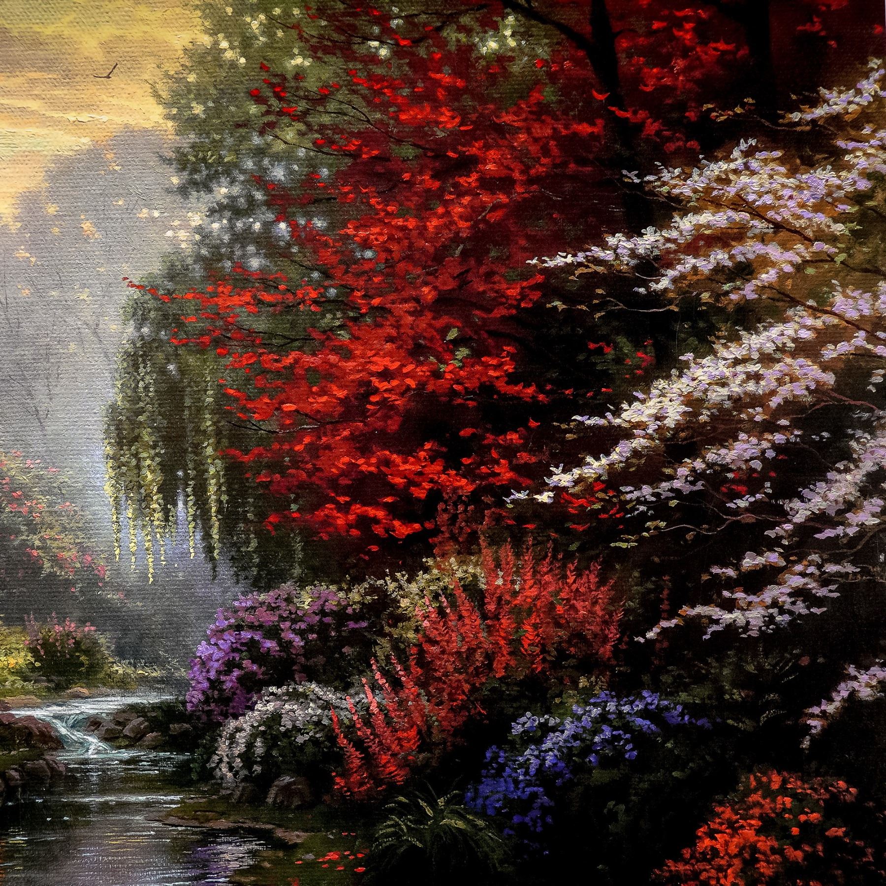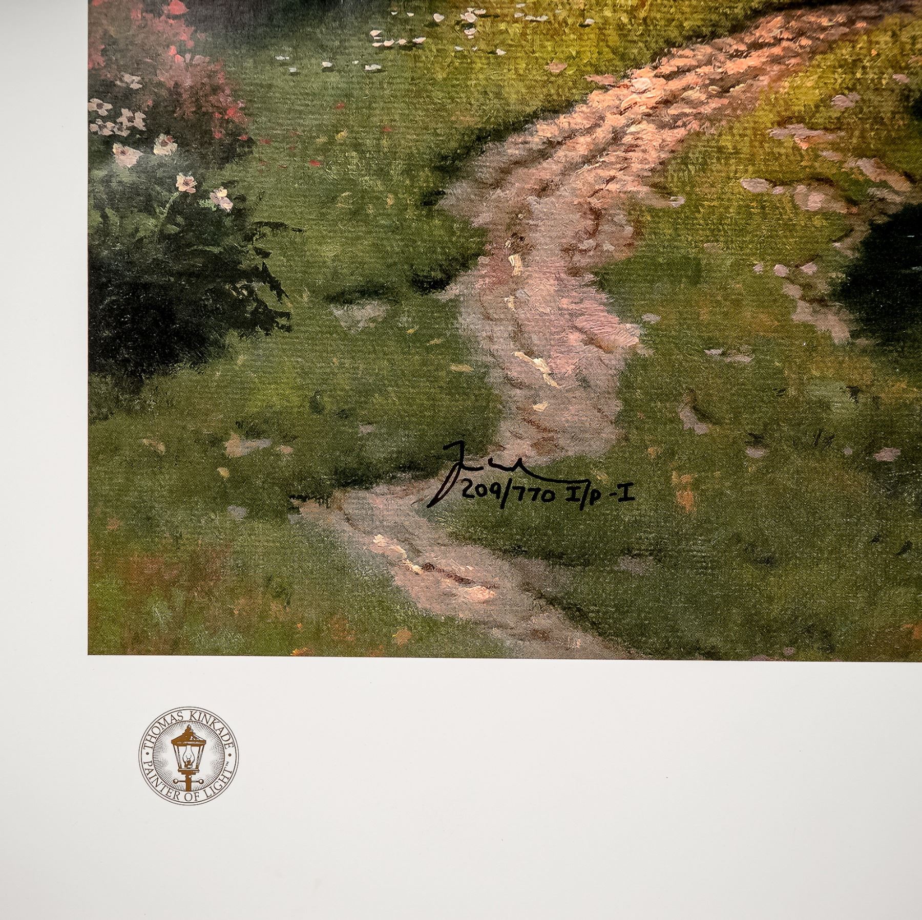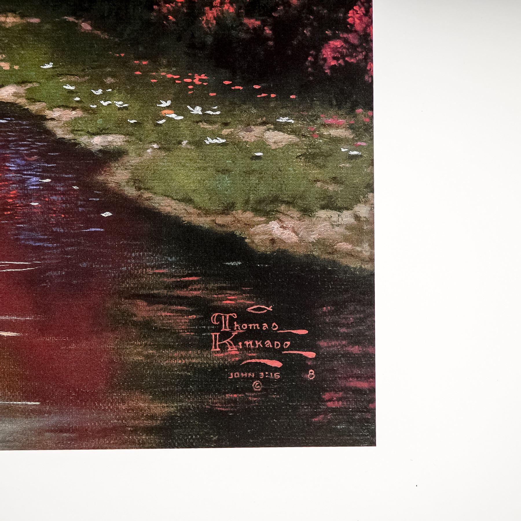A serene and enchanting limited edition poster print by Thomas Kinkade, celebrated worldwide as the Painter of Light. Entitled A Quiet Evening, from the Places in the Heart I series, this luminous work captures a glowing thatched cottage nestled among vibrant blossoms beside a tranquil stream at sunset. Kinkade's mastery of radiant light and pastoral charm is on full display, creating an atmosphere of warmth, peace, and timeless beauty. A striking work that exemplifies Kinkade's devotion to capturing idyllic moments of comfort and serenity, making it a sought-after addition to any collection of fine American art. This hand-signed limited edition is numbered 209/770 I/P (International Proof) bearing the artist's signature on the left side, along with his distinctive printed signature and Christian reference. Published in 1998 by Media Arts Group, this edition features the official Thomas Kinkade seal of authenticity.