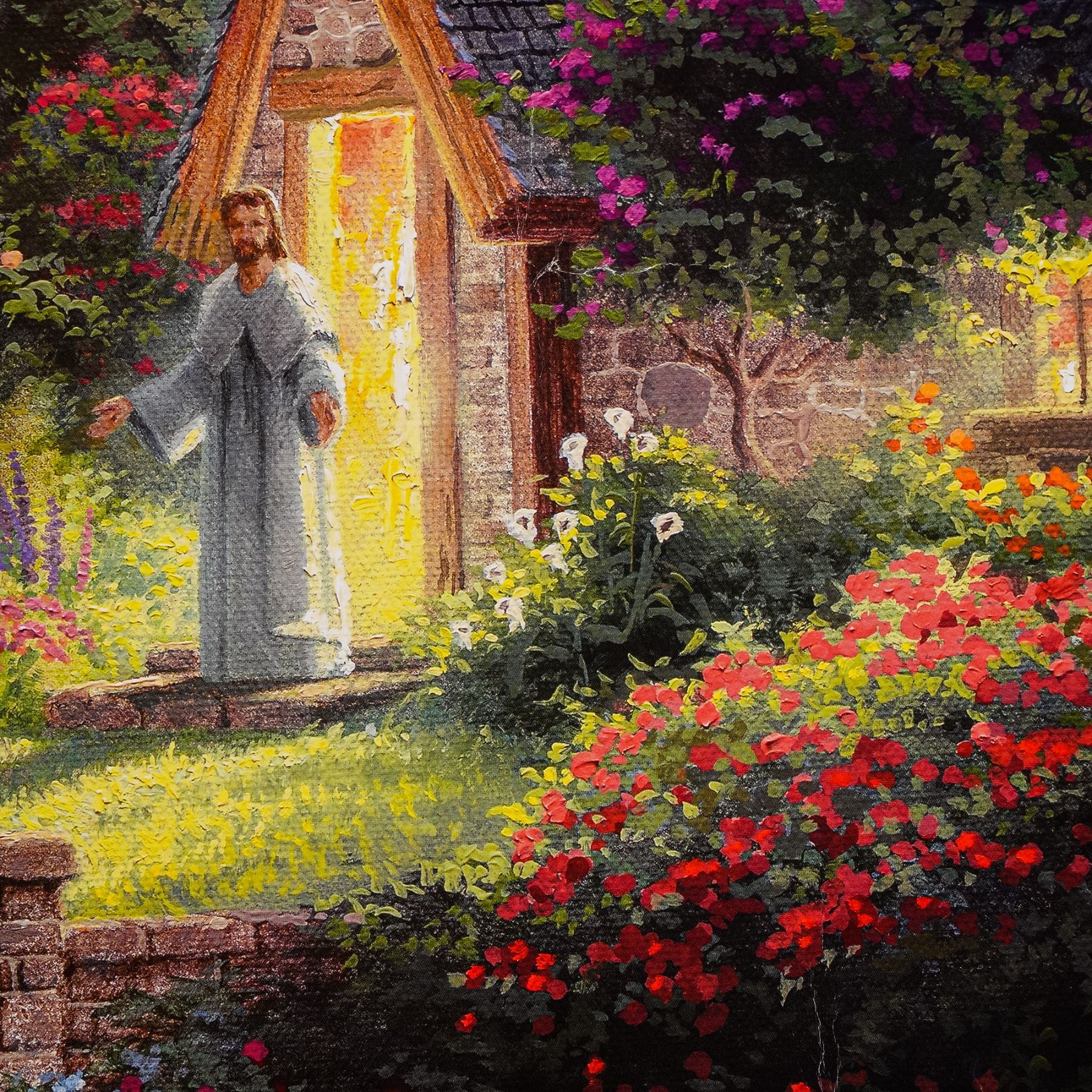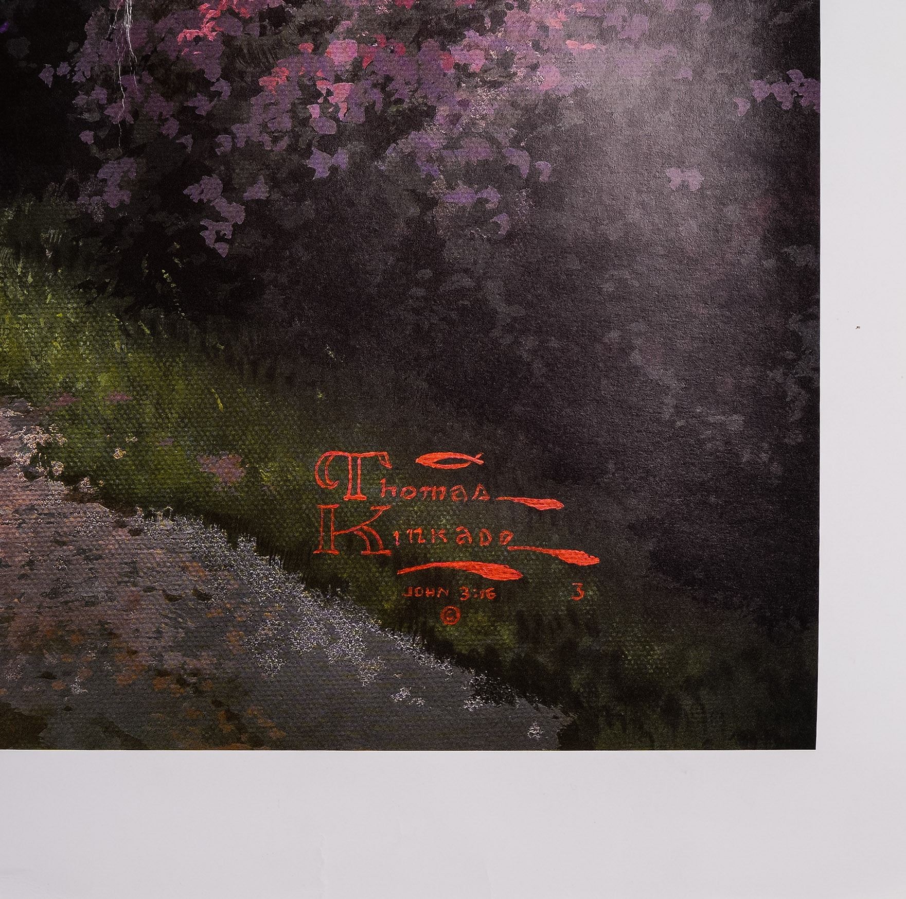 This luminous limited edition poster print, The Good Shepherd's Cottage (The Good Shepherd I), captures Thomas Kinkade's signature style of glowing cottages and radiant light, blending spiritual symbolism with pastoral serenity. Painted with a masterful interplay of color and light, the scene depicts Christ guiding a flock of sheep at the entrance of a charming stone cottage surrounded by vibrant gardens and a golden-hued sky. Thomas Kinkade, widely celebrated as the Painter of Light, is known for his ability to evoke warmth, faith, and tranquility through his art, making this edition a treasured collector's piece. Signed by the artist, the work includes his hallmark scripture reference John 3:16 and is numbered 439/570 I/P (International Proof), underscoring its rarity.