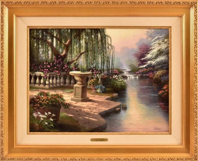 "The Garden of Prayer III" 190/1200 G/P canvas, 18" x 24". Hand-highlighted by Kinkade artist, with COA. There is a signature on the backside of canvas.