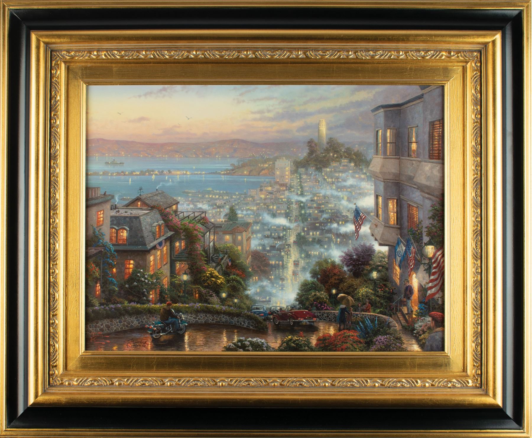 Color limited edition 23.5 x 17.5 print on canvas of Thomas Kinkade's painting entitled 'San Francisco, Lombard Street,' numbered 604/690 AP, with hand-highlights by a Thomas Kinkade Master Apprentice. The lower left corner bears an autopen signature of Kinkade. Framed to an overall size of 35 x 29. In fine condition. Accompanied by a certificate of authenticity from the publisher.