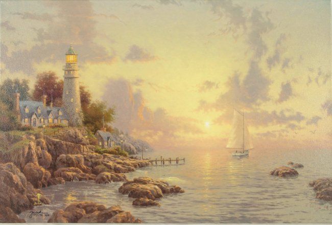 Thomas Kinkade, Titled: The Sea of Tranquility (Seaside Memories V) limited edition lithograph on canvas, hand embellished, hand signed by the artist in black pen and numbered from the edition of 43/1190IP, publisher certificate included along with Hologram Thomas Kinkade seal on verso, and international proof gold logo in the bottom left margin. Measures approx 18 x 27 inches, unframed, stretched canvas Condition: Mint