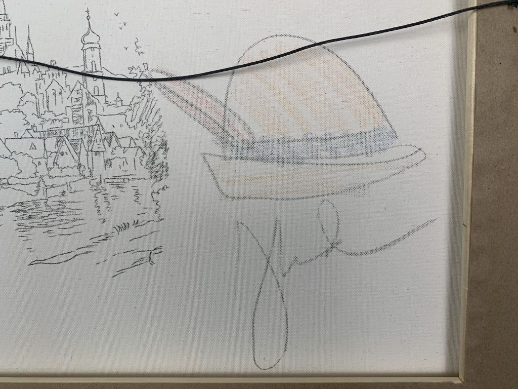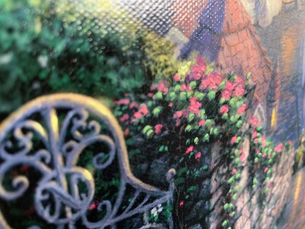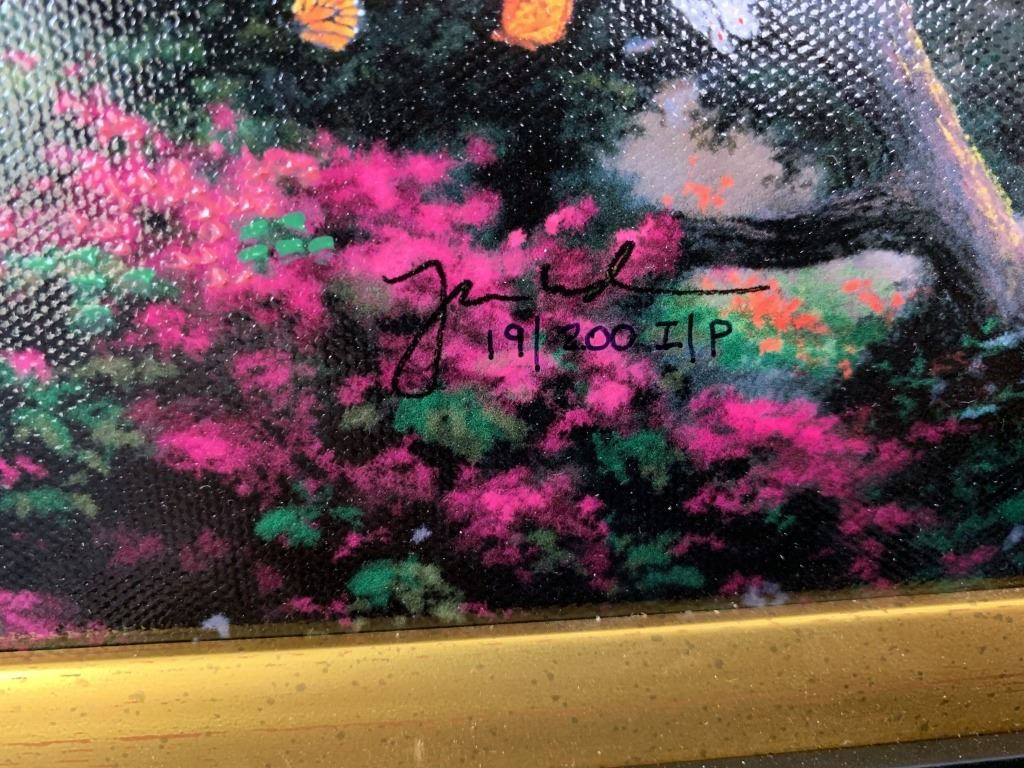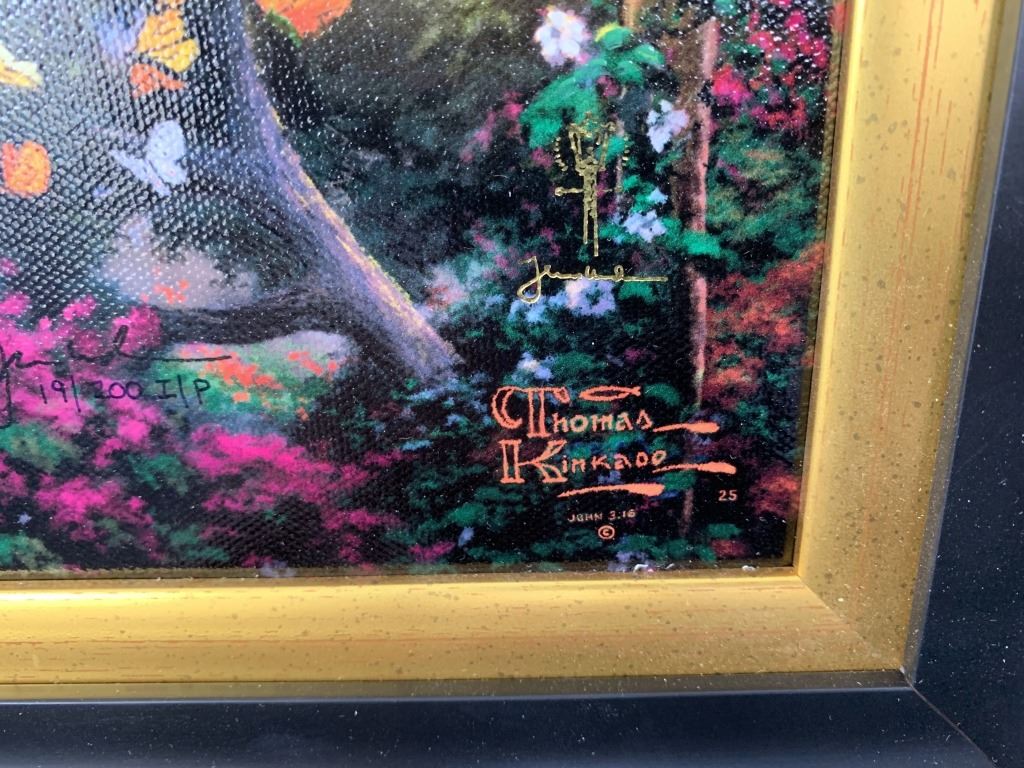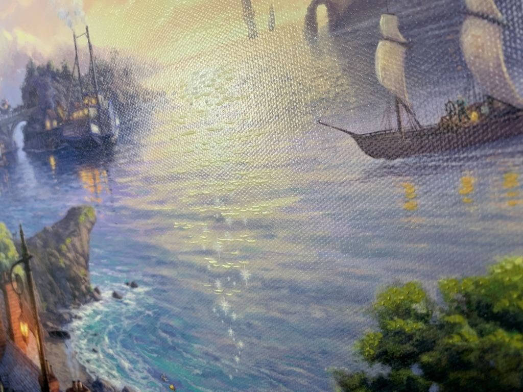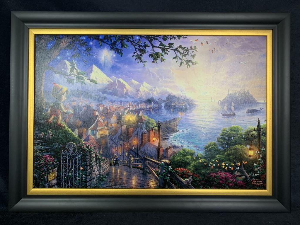 Thomas Kinkade's "Pinocchio Wishes Upon a Star" limited edition embellished canvas, signed and numbered 19/200 I/P. A beautiful piece of Pinocchio overlooking the water, with Tinkerbell in the sky. This piece has a hand drawn remarque on the back of the canvas, and has been hand signed by Thomas Kinkade. It has been professionally custom framed with an inner frame liner.
