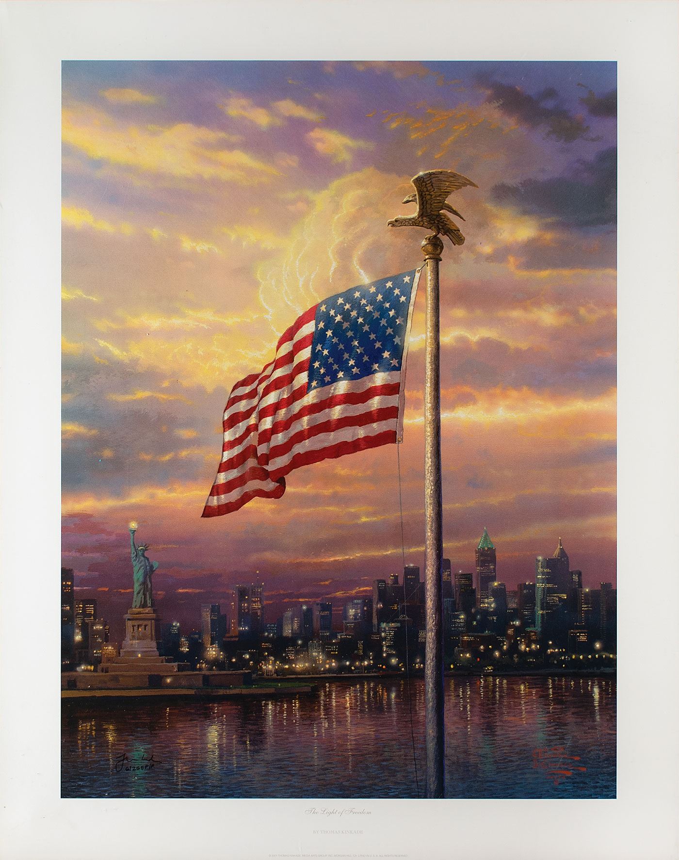 Patriotic limited edition color 22 x 28 print of a Thomas Kinkade painting entitled 'The Light of Freedom,' numbered PP 6/265, depicting an unfurled American flag against a New York City backdrop with the Statue of Liberty, signed in the lower left in black felt tip by the artist. Rolled and in fine condition, with trivial creasing to lower right corner.