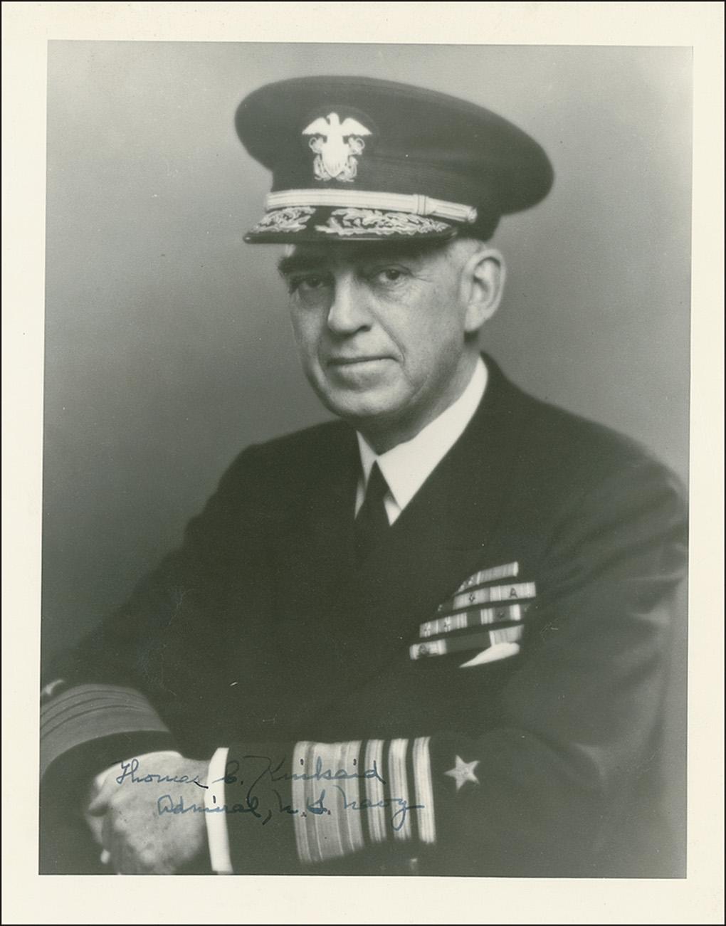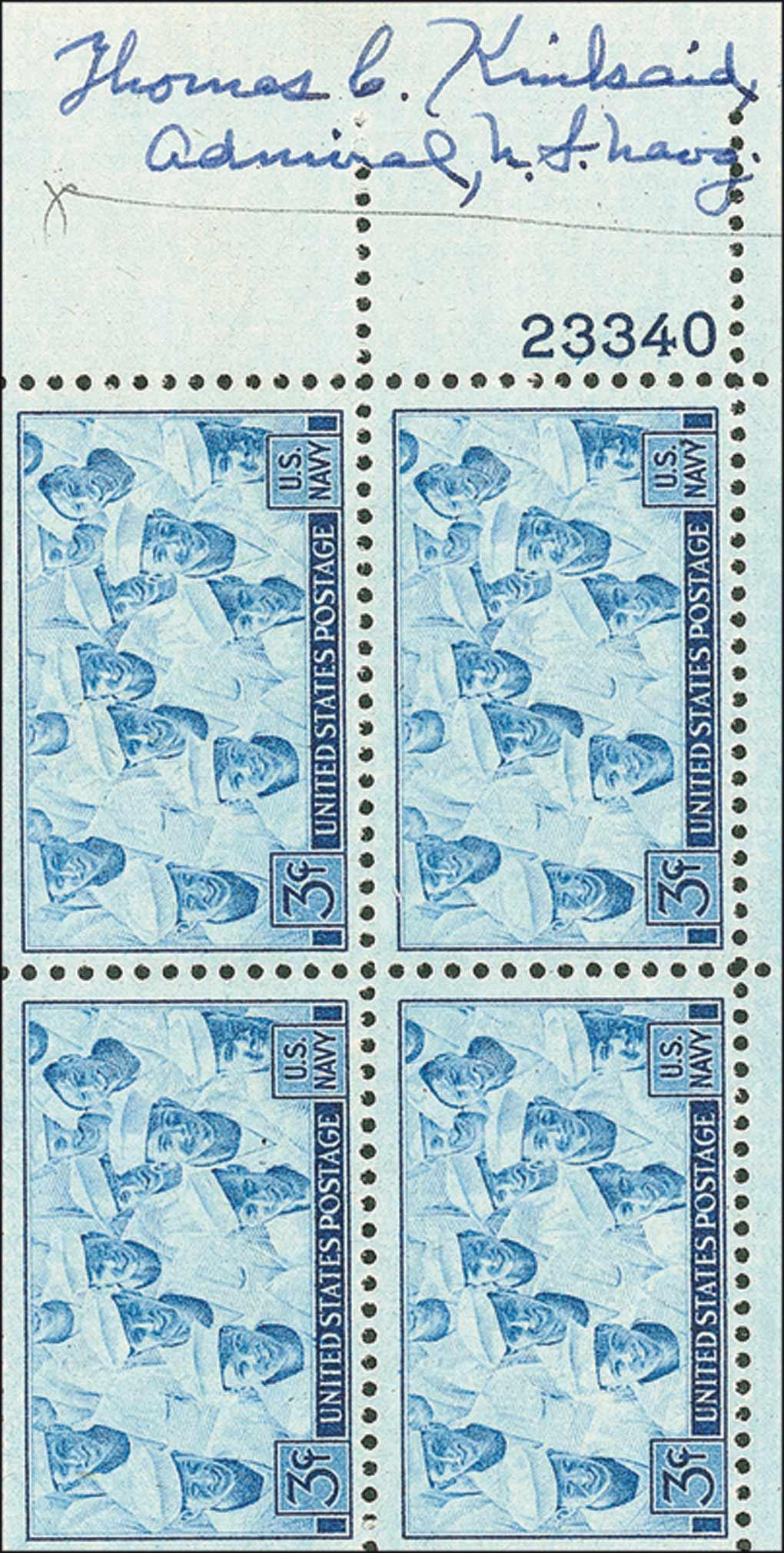 Commander of the North Pacific Force and a brilliant military tactician. Vintage matte-finish 8 x 10 photo of Kinkaid in full uniform; signed in fountain pen; and a block of four three-cent U. S. Navy commemorative postage stamps, signed in the border in blue ink by Kinkaid. In fine condition, with several creases and dings to photo, as well as some light contrast to signature.