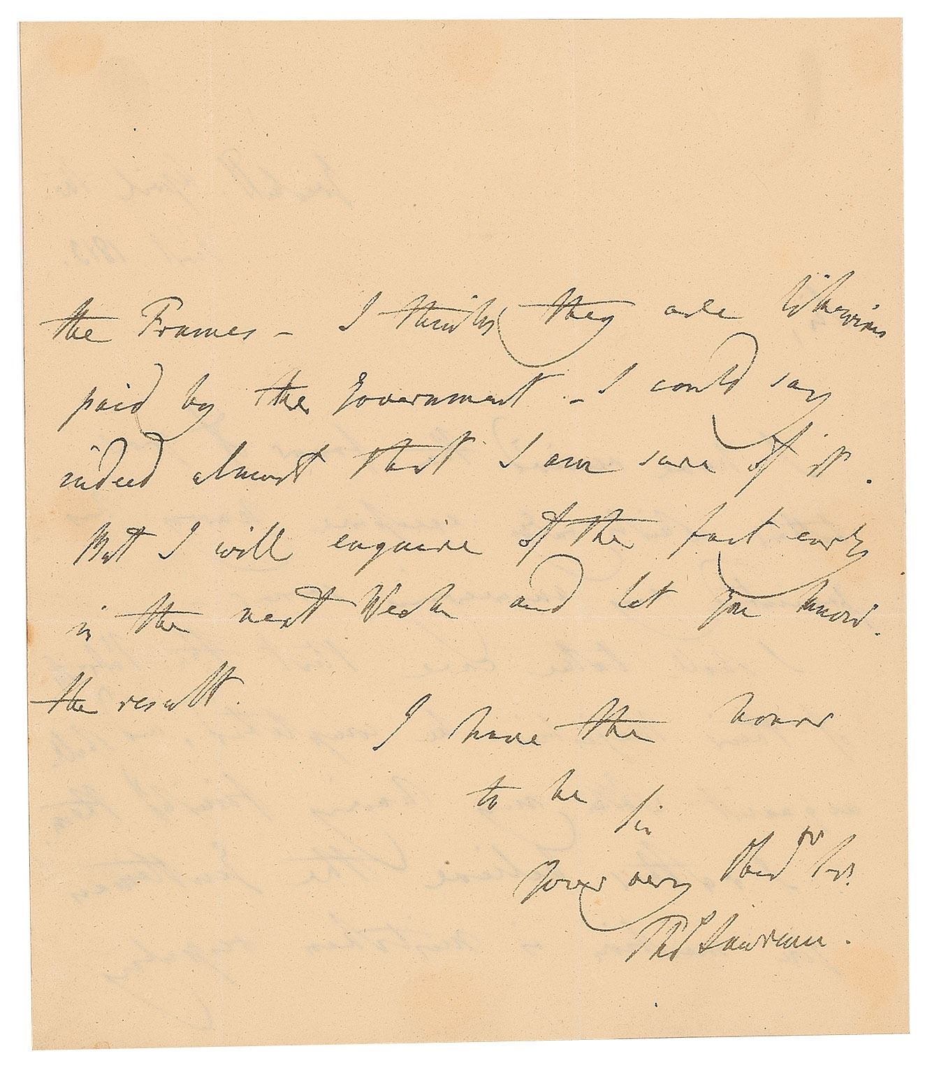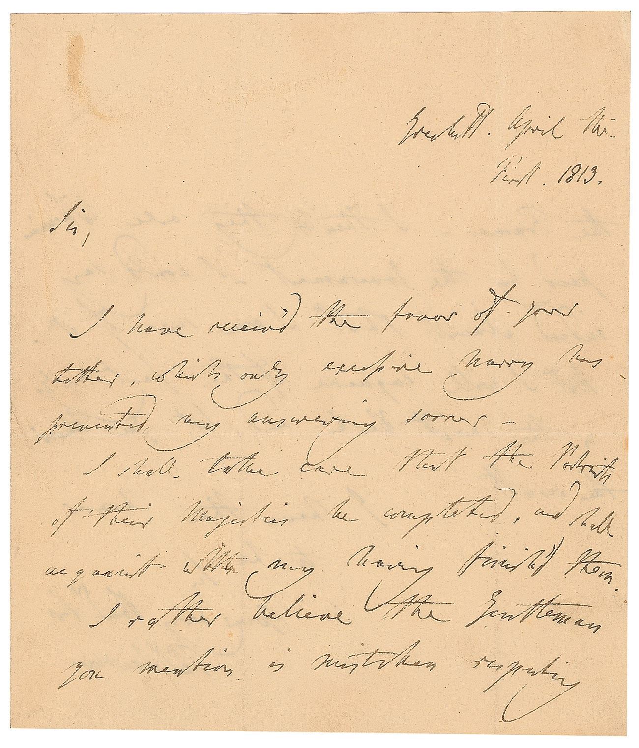 Leading English portrait painter (1769–1830) who served as the fourth president of the Royal Academy. ALS signed “Tho's Lawrence,” one page both sides, 6 x 7, April 1, 1813. Letter to a gentleman, in part: "I shall take care that the portraits of their Majesties be completed, and shall acquaint upon my having finished them. I rather believe the gentleman you mention is mistaken respecting the Frames. I think they are likewise paid by the Government. I could say indeed almost that I am sure of it. But I will enquire of the fact early in the next week and let you know the result." In fine condition, with trimmed edges and light stain to the upper left corner. In 1791, King George III had appointed Lawrence as 'painter-in-ordinary to His Majesty,' a position that the painter held until his death in 1830.