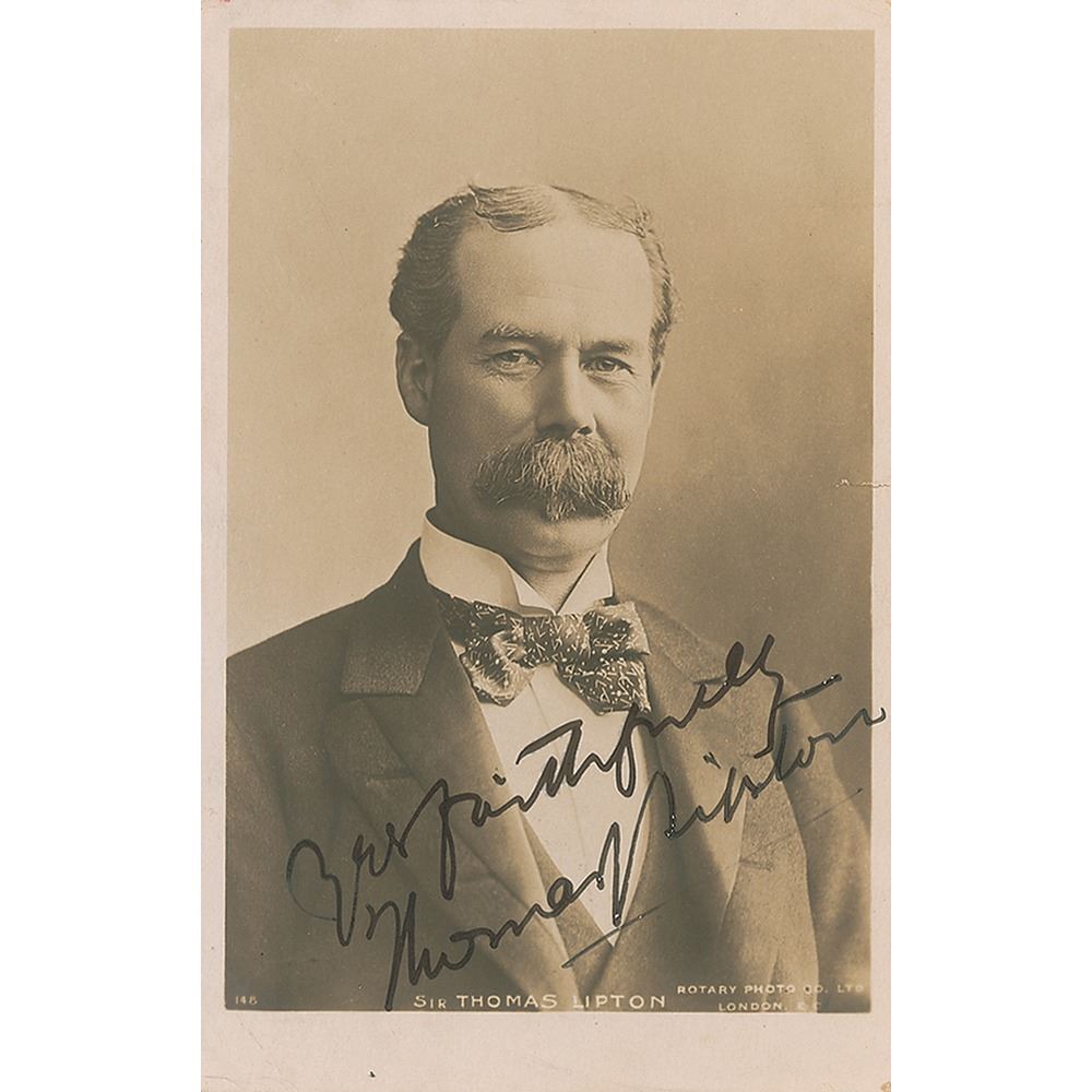 Merchant and yachtsman (1848-1931) who created the Lipton tea brand and was the most persistent challenger in the history of the America's Cup. Vintage matte-finish 3.25 x 5.25 postcard photo of Lipton wearing a bow tie, neatly signed in ink, "Yrs faithfully, Thomas Lipton." In fine condition, with a very small tear to the right edge.
