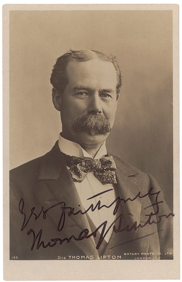 Self-made man, merchant, and yachtsman (1848–1931) who created the Lipton tea brand and was the most persistent challenger in the history of the America's Cup. Vintage 3.25 x 5.25 postcard photo, signed in fountain pen, “Yrs faithfully, Thomas Lipton.” In fine condition.