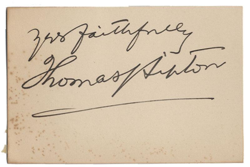 THOMAS LIPTON,(1850-1931). Merchant. The Scottish-born Lipton started his career as a grocer’s clerk, but soon opened a chain of food stores. He entered the tea business and made a fortune, especially through the new medium of advertising. He turned his attention to yatching and unsuccessfully tried to win the America’s Cup five times. He left his fortune for hospital construction. Signed card with sentiment. 4 1/2" x 3". "Yrs faithfully, Thomas J. Lipton". Some light foxing at left, otherwise fine.