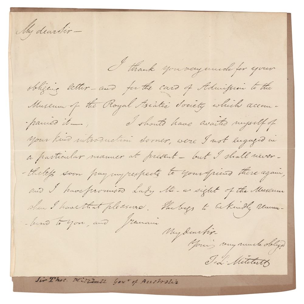 Important surveyor, mapmaker, and explorer of Southeastern Australia (1792–1855) who served as Surveyor General of New South Wales from 1828 until his death. Scarce ALS signed “T. L. Mitchell,” one page, 6.75 x 6.5, no date. Handwritten letter, in part: "I thank you very much for your obliging letter—and for the card of Admission to the Museum of the Royal Asiatic Society which accompanied it…I have promised Lady M. a sight of the Museum when I have that pleasure." Affixed to a slightly larger sheet and in fine condition.