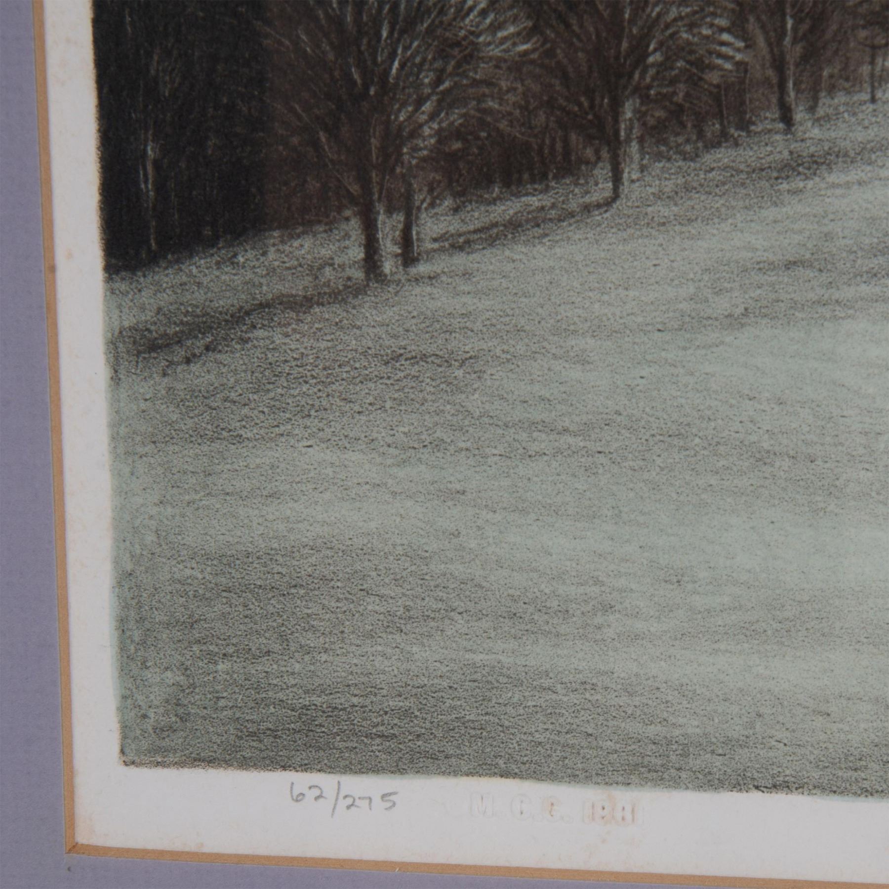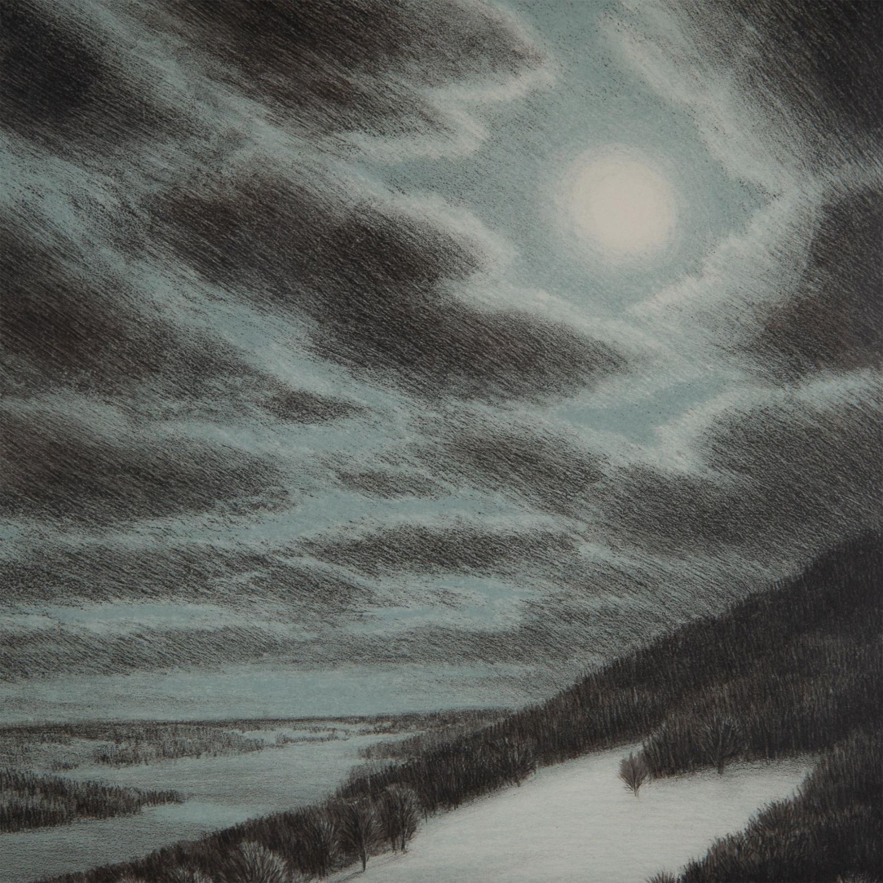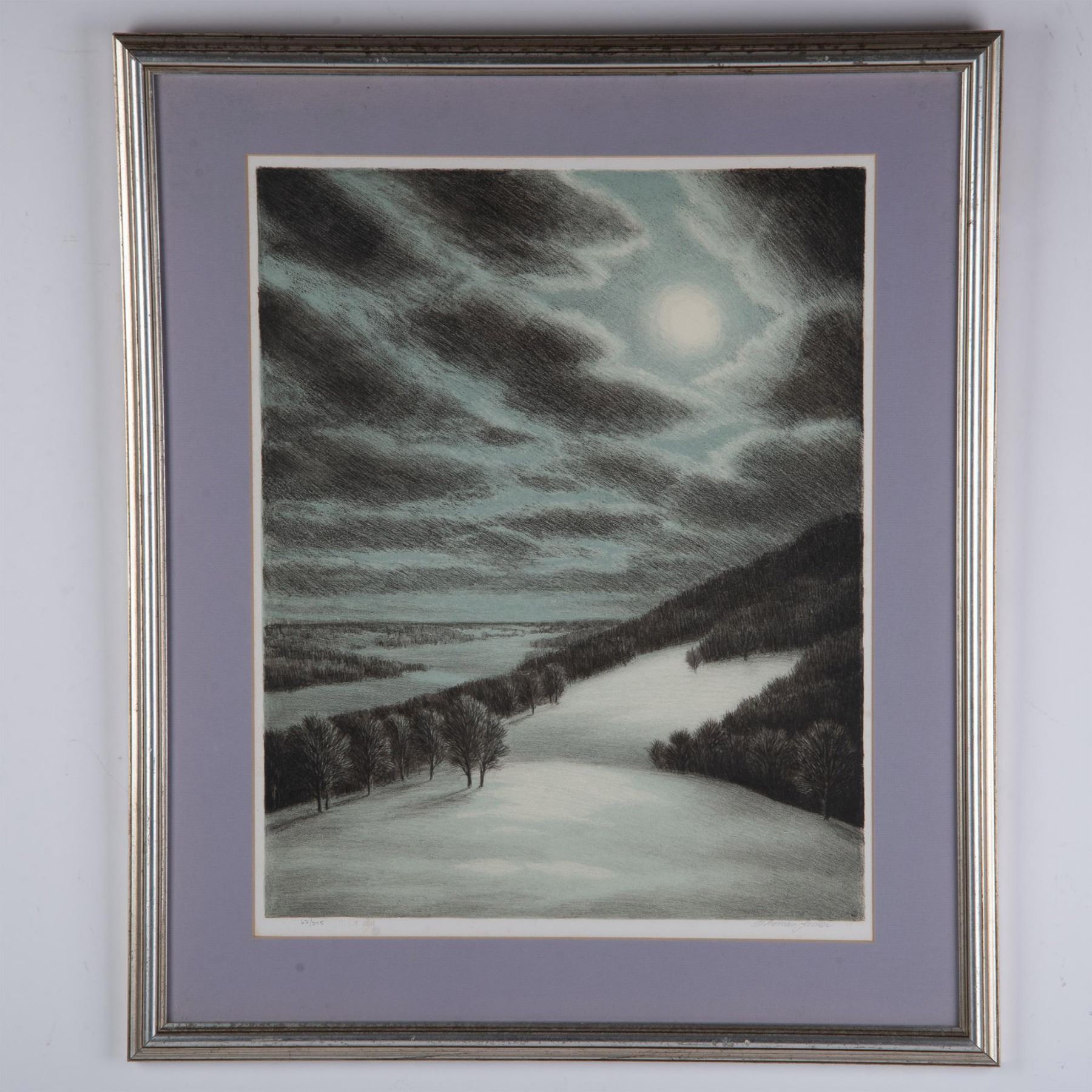 Winter Hill is a large original lithograph on paper by American painter and award winning illustrator Thomas Locker known for conveying the sublime nature of isolated landscapes in his artworks. Signature in graphite on lower right: Thomas Locker. Edition number on lower left 62/275 next to blind stamp: MCG 1981. Housed in a silver gilded frame with a purple-grey mat. Sight size: 16.25"L x 20.75"H. Frame dimensions: 23.25"L x 27.25"H x 1.25"W. Artwork can be unframed and rolled for shipment.