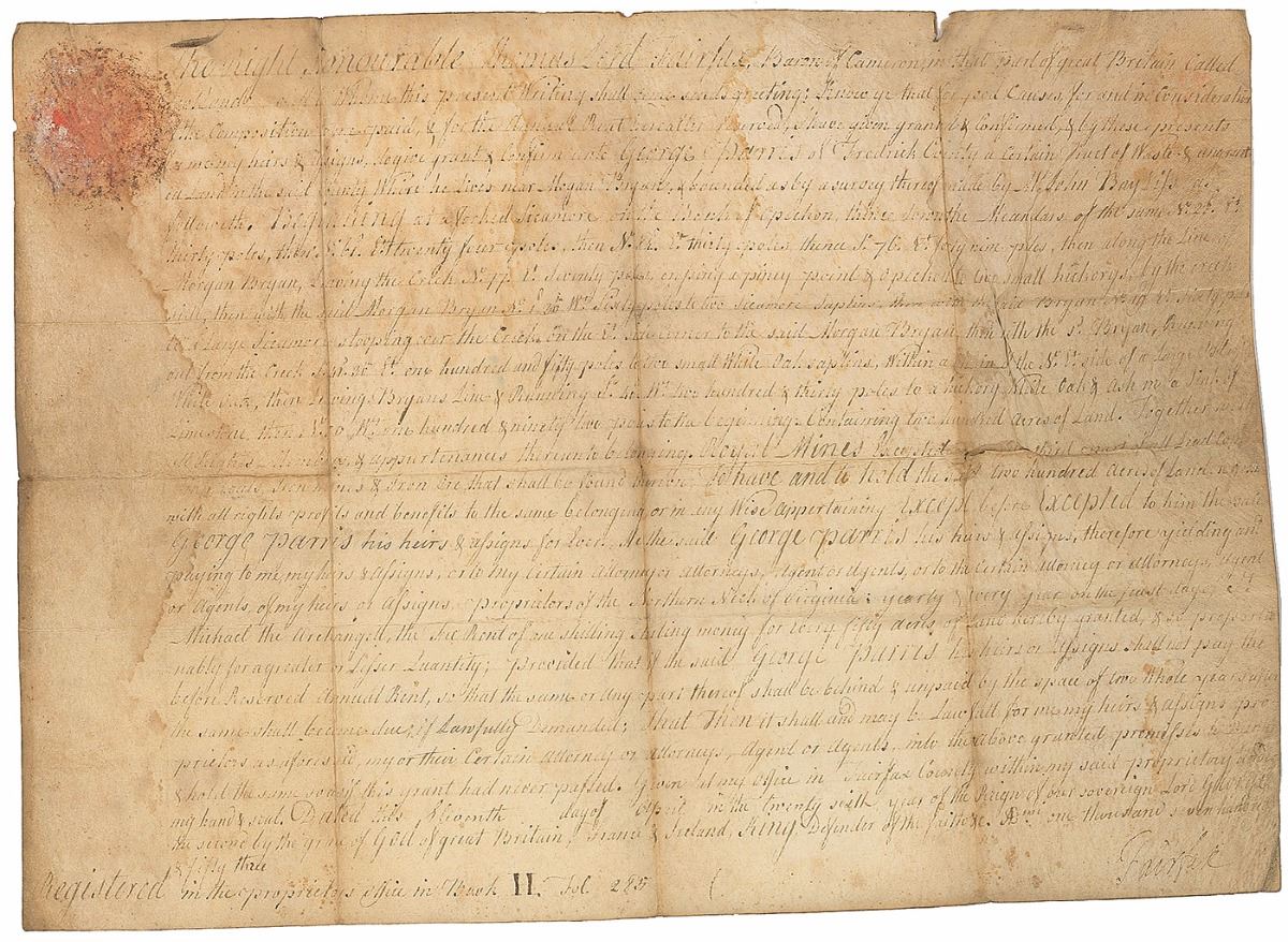 The only resident peer in late colonial America who administered his vast Northern Neck Proprietary from his wilderness estate at Greenway Court, Virginia (1693–1781). Vellum manuscript DS, signed “Fairfax,” one page, 13.5 x 9.75, April 11, 1753. Fairfax grants George Parris of Frederick County, Virginia, a tract of land. In good to very good condition.