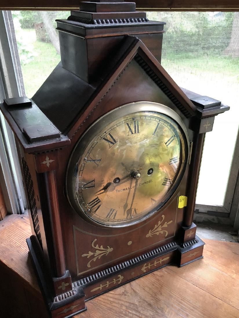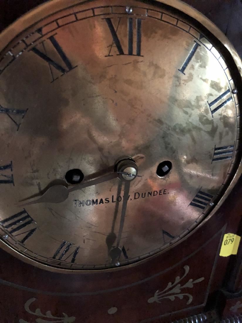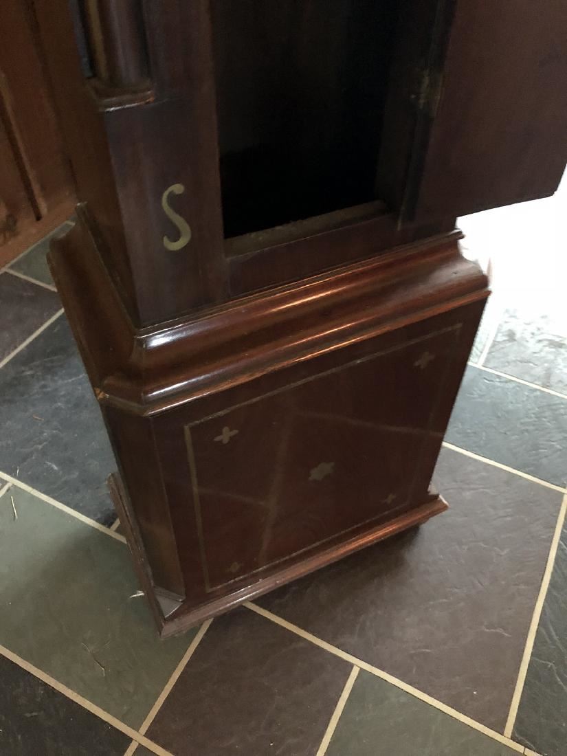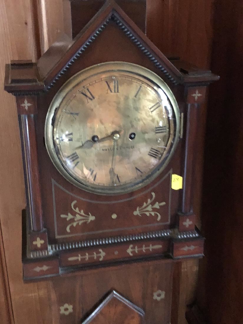 Beautiful English clock by Thomas Low. Dundee with fusee movement. Beautiful inlay, burl on front, steeple top. Measures approx. 60" tall. (RL)