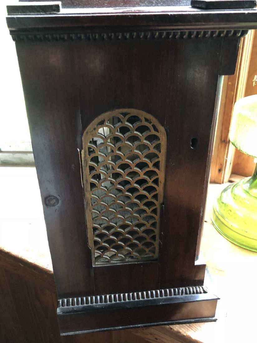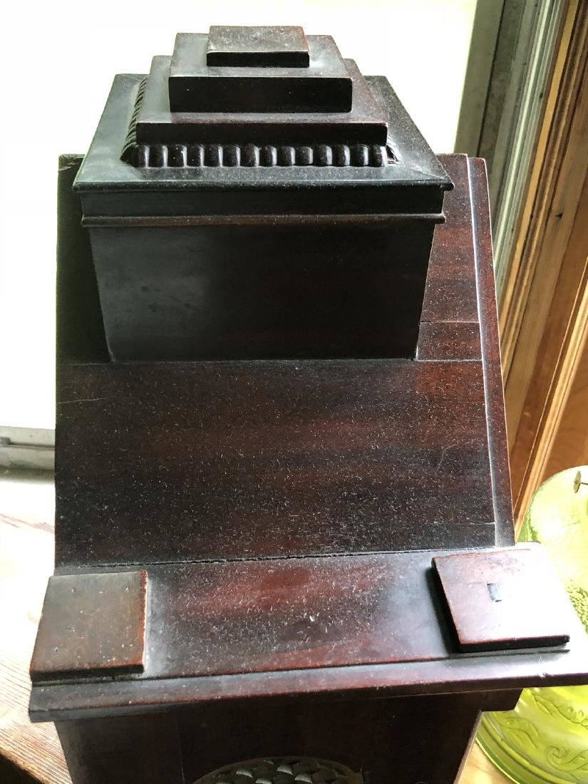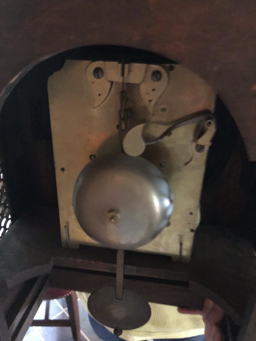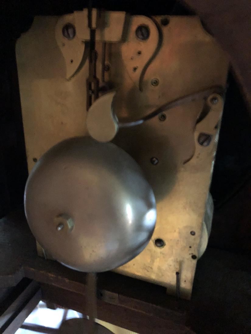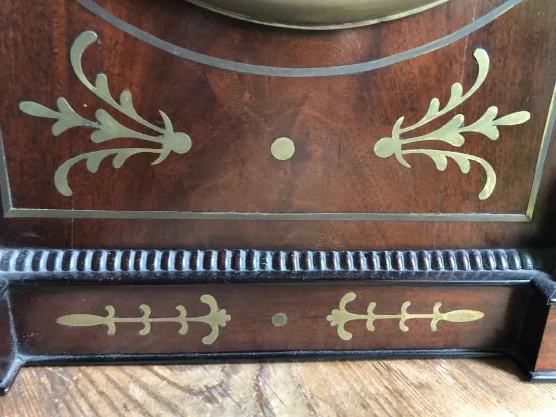 Beautiful English clock by Thomas Low. Dundee with fusee movement. Beautiful inlay, burl on front, steeple top. Measures approx. 60" tall. (RL)